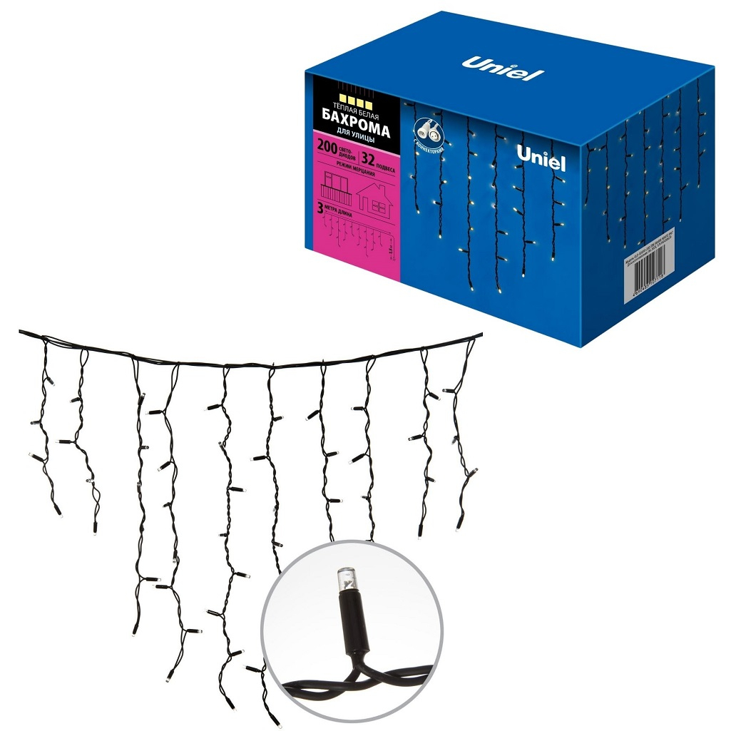 Гирлянда светодиодная Uniel ULD-B3010-200/TBK Warm white IP67, бахрома, Теплый белый UL-00003934, 3 м