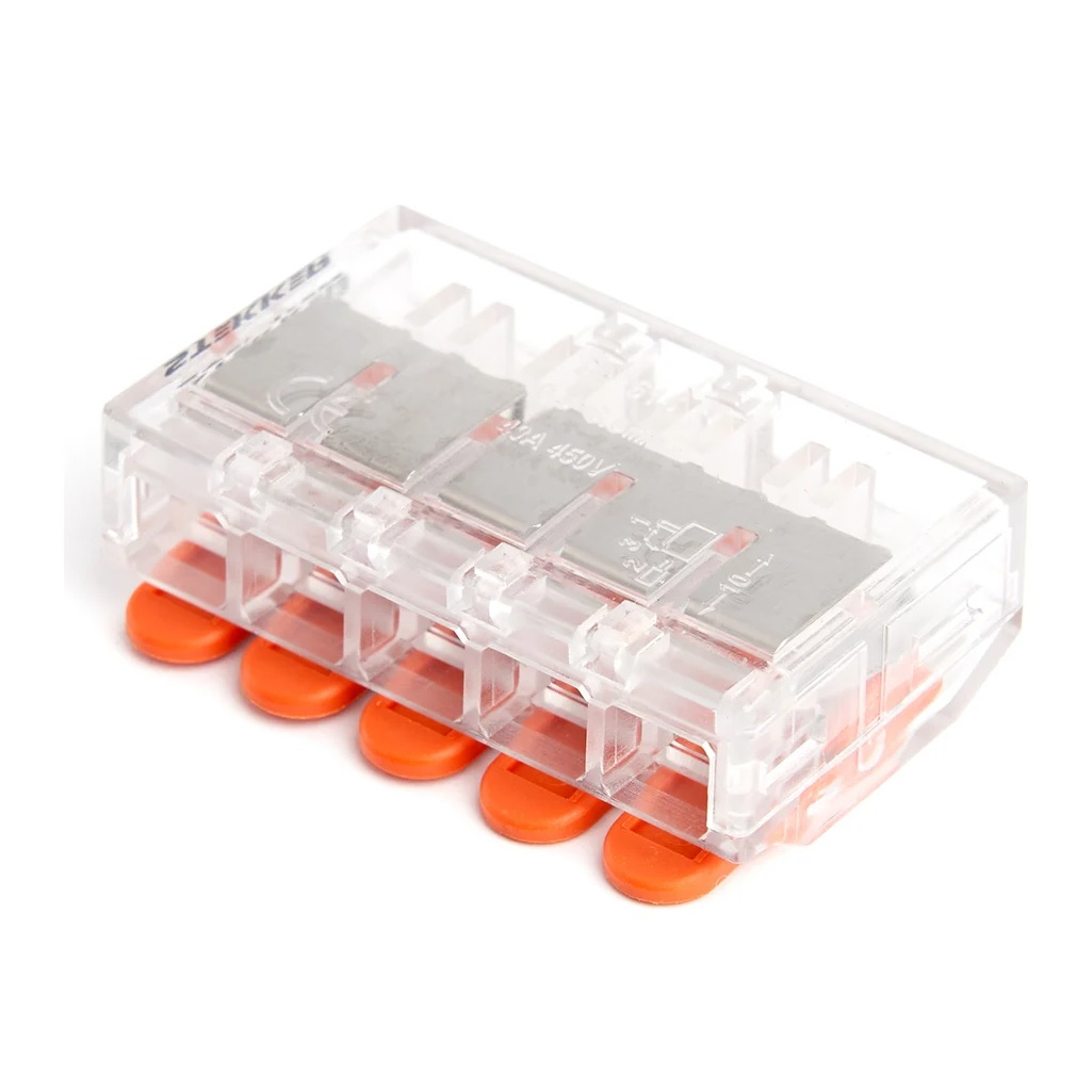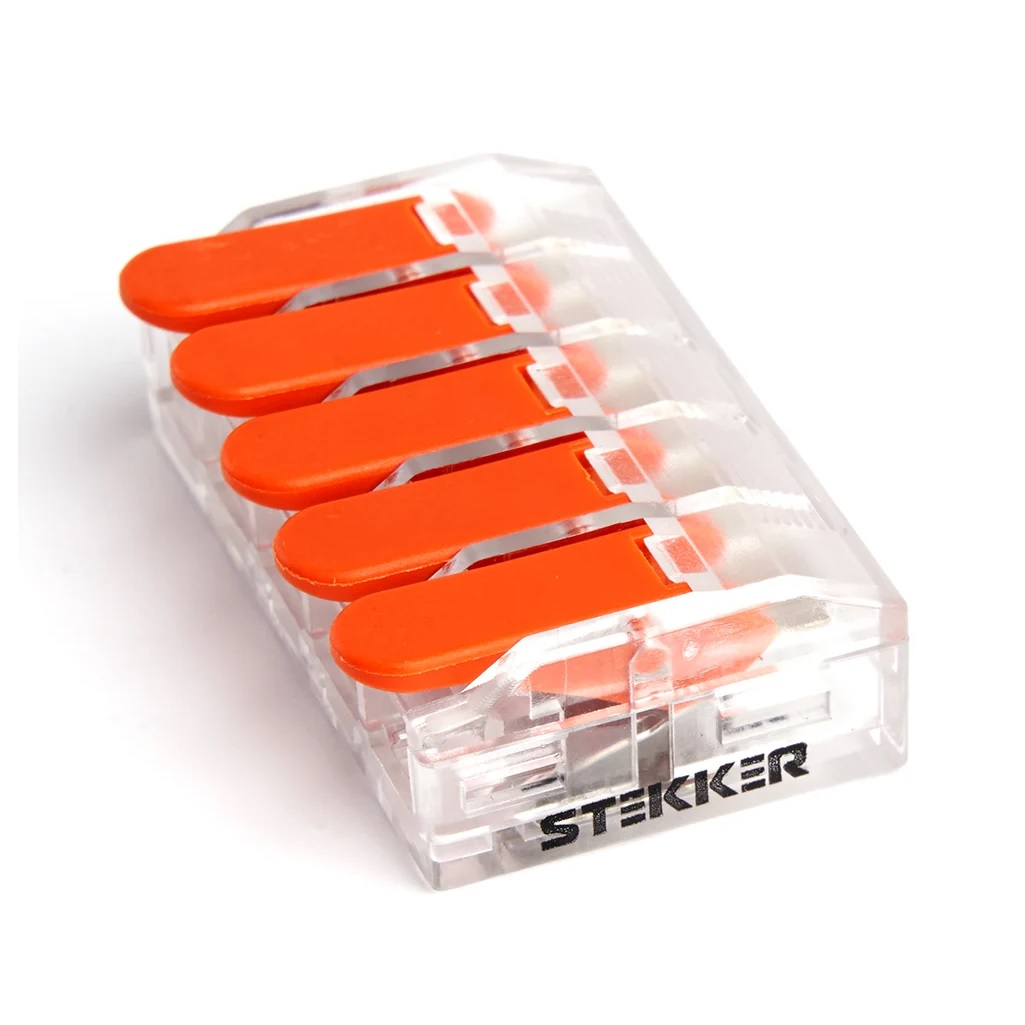 Клемма Stekker LD221-615 5-проводная, двойная система фиксации, сквозная проводимость - идеальное решение для профессиональных электромонтажников! 5 независимых каналов с индивидуальными зажимами: сечение проводов: 0.5-4 мм² (гибкие/одножильные), макс. ток: 24А на канал (общий до 50А). Двойная система фиксации: пружинный зажим (без инструмента), винтовой доводчик (ключ 3.5 мм), сквозная проводимость – возможность последовательного подключения.
