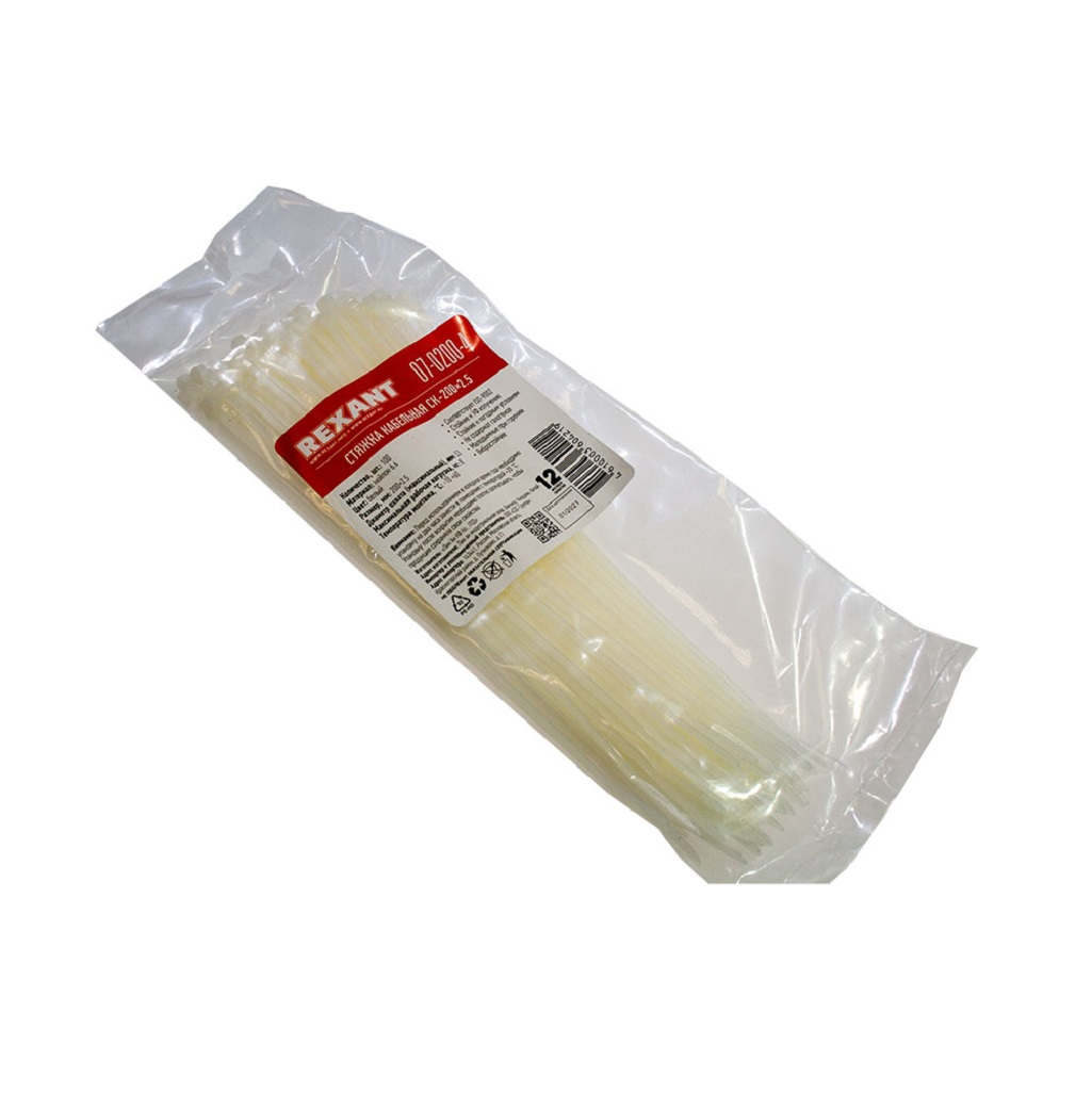 Стяжка кабельная Rexant 07-0200-4 нейлон 2.5х200 мм, упаковка 100 шт, белый - это стягивающий элемент, который применяется для соединения, фиксации, зажима, захвата и стягивания различных предметов. Стяжки нередко применяются при электромонтажных работах для крепления и соединения в жгут проводов, кабелей и любых разновидностей труб. Они применимы во многих сферах и пользуются популярностью в быту и в хозяйстве на даче, в огороде, в саду. Стяжка кабельная представляет собой гибкую полоску из нейлона с замковым механизмом одностороннего действия.
