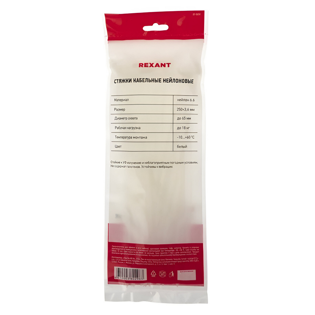 Технические характеристики стяжки Rexant 07-0250 нейлон 3.6х250 мм, упаковка 100 шт, белый