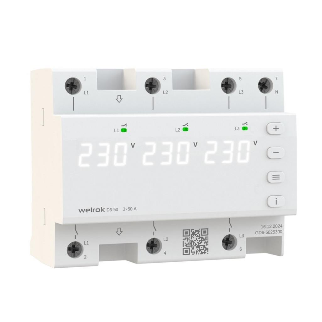Реле Welrok D6-50 контролирует не только превышение и понижение напряжения, но также следит за перекосом фаз, чередованием и обрывом. Это особенно важно для трехфазных двигателей, работающих в системах водоснабжения, вентиляции или отопления. При возникновении нештатной ситуации реле мгновенно отключает нагрузку, а после восстановления параметров автоматически подает питание с заданной задержкой.