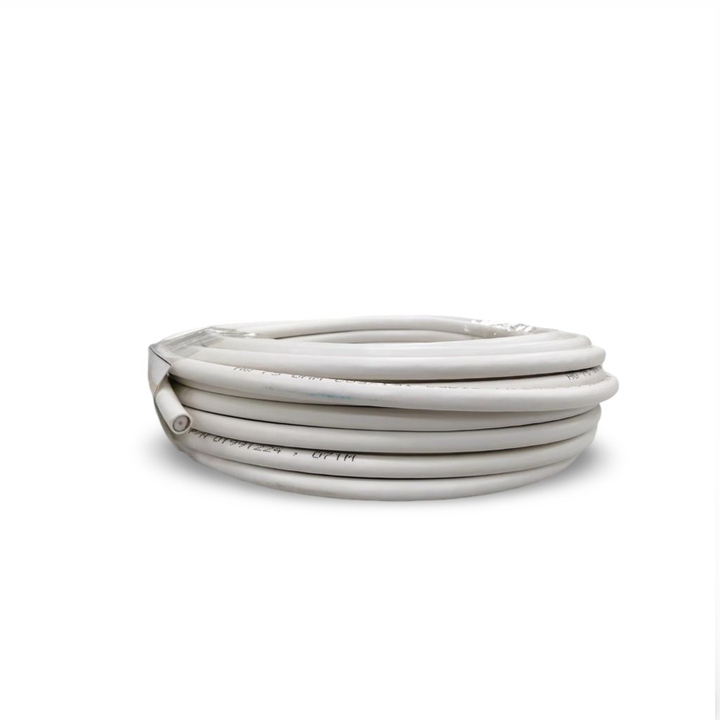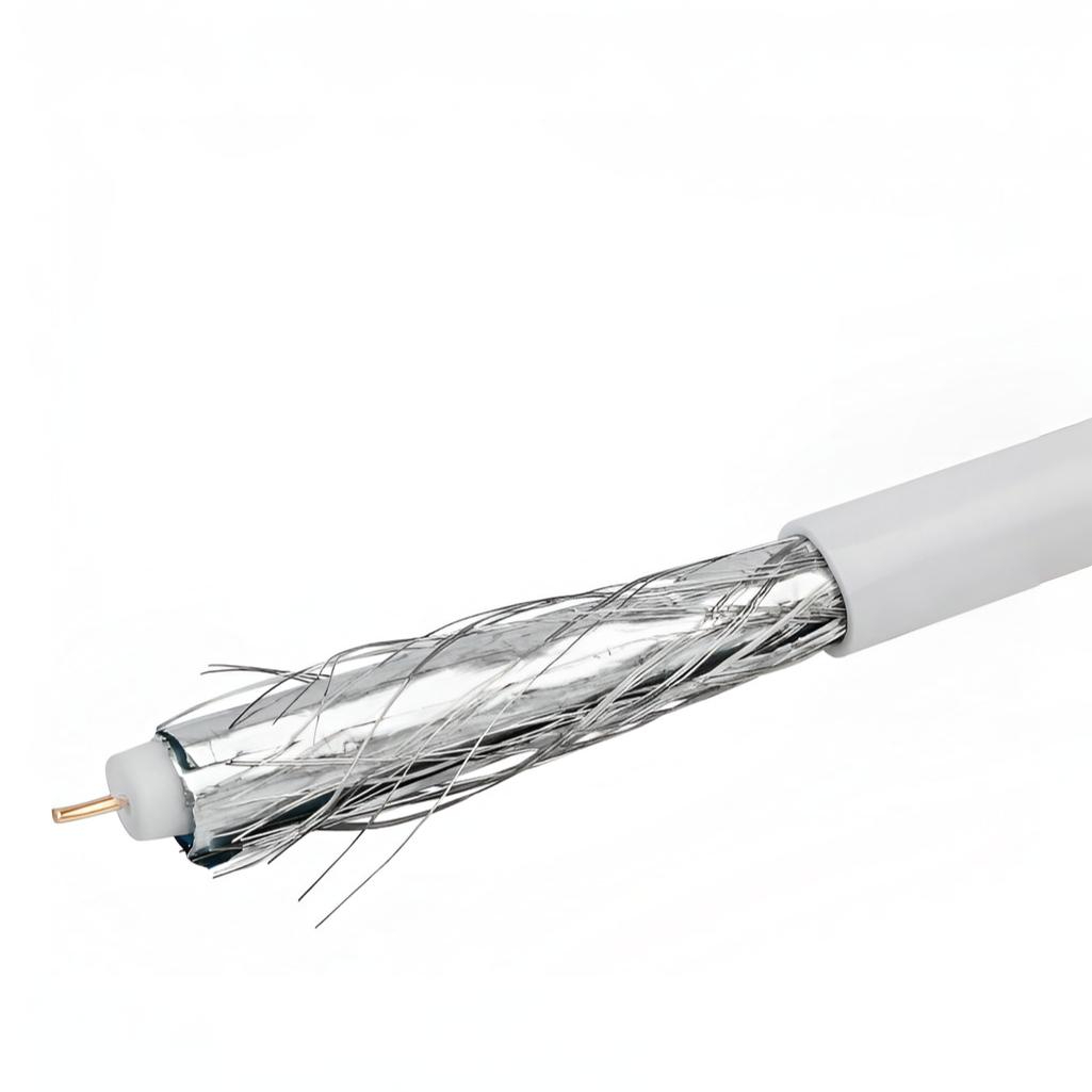 Кабель коаксиальный RG-6, 1х0.9 кв.мм, телевизионный, белый, длина 30 метров ― многослойный провод, который состоит из токопроводящей жилы, оформленной несколькими защитными слоями и изоляционной оболочкой.