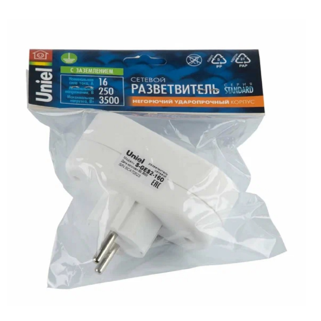 Разветвитель сетевой 2-местный Uniel S-GES2-16O 6703, защитные шторки, с заземлением, белый, 3.5 кВт - это оптимальное сочетание безопасности, функциональности и долговечности. Идеален для активного использования в быту и профессиональной среде. Защита от перегрузки – автоматический выключатель (16А) предотвращает перегрев. Ударопрочный корпус – из негорючего ABS-пластика с термостойкостью до 750°C. Защитные шторки – предотвращают случайное попадание посторонних предметов. Усиленные контакты – латунные, с никелевым покрытием для устойчивости к искрению.