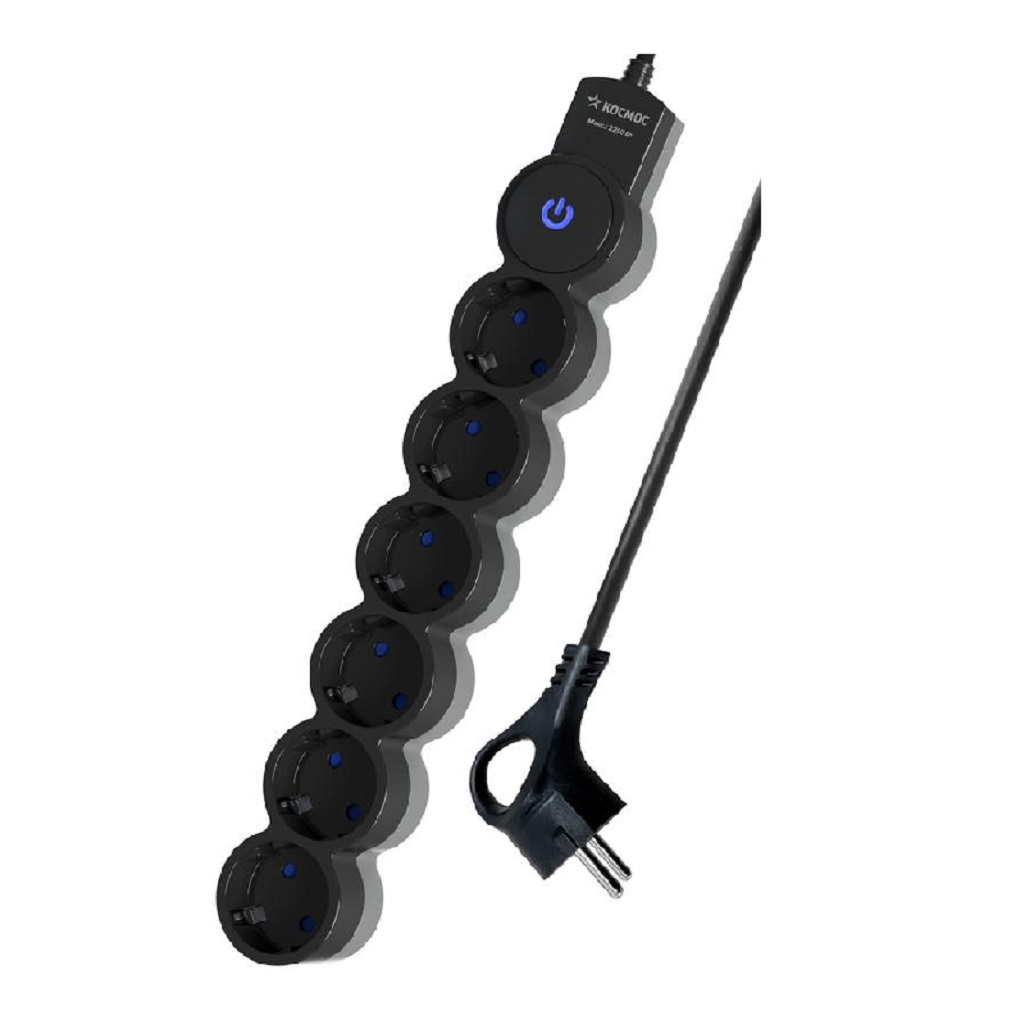 Удлинитель Космос YKsm1.5m-6g-Z-V10A-B 1801984 с заземлением и выключателем, 6 розеток, 1.5 м, 2.2 кВт, черный