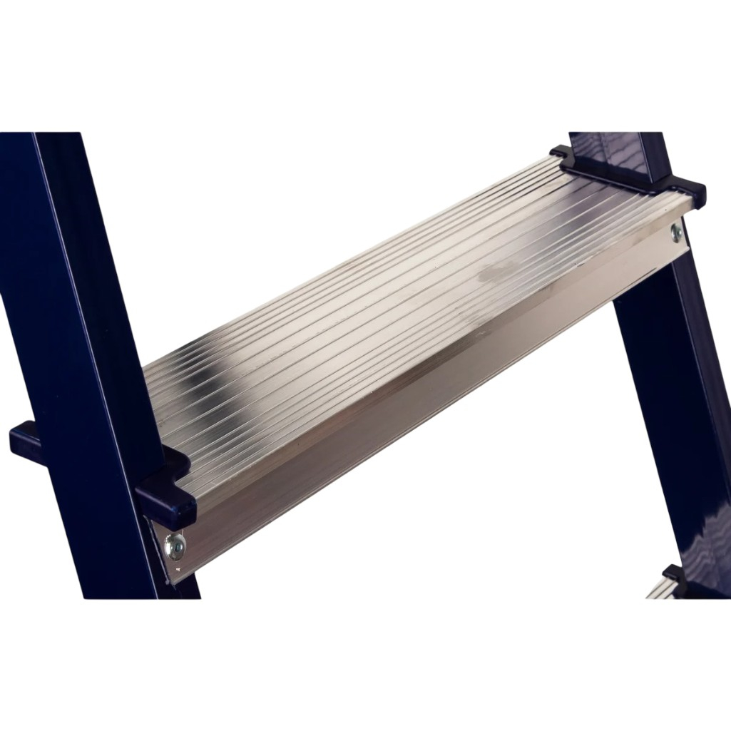 Максимальная нагрузка в 150 кг позволяет безопасно использовать лестницу взрослым человеком вместе с инструментами. Широкая рабочая платформа и глубокое рифление ступеней гарантируют удобство и безопасность при подъеме и спуске.