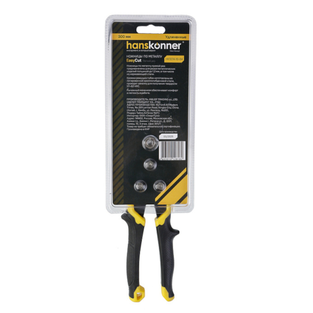 Технические характеристики ножниц по металлу Hanskonner HK1074-10-04, длина 300 мм, прямой рез