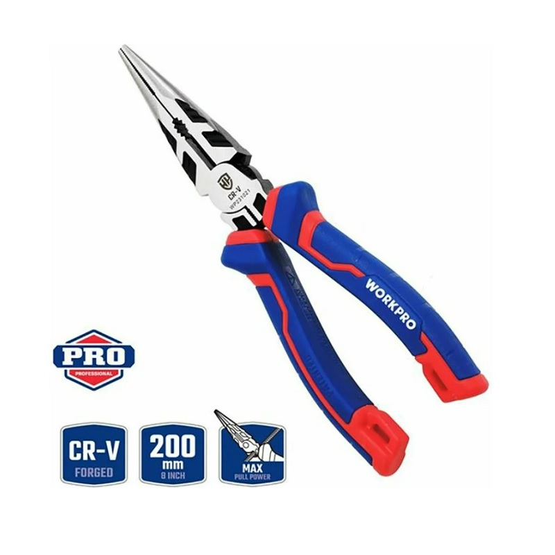 Длинногубцы Workpro 200 мм, 8 дюймов используются для различных монтажных, ремонтных и слесарных работ. Эргономичные трехкомпонентные рукоятки обеспечивают надежный хват и не скользят в руках. Инструмент изготовлен из кованой хромованадиевой стали. Материал отличается высокой прочностью и долговечностью. Инструмент можно использовать как съемник проволоки, а также для вытягивания кабеля.