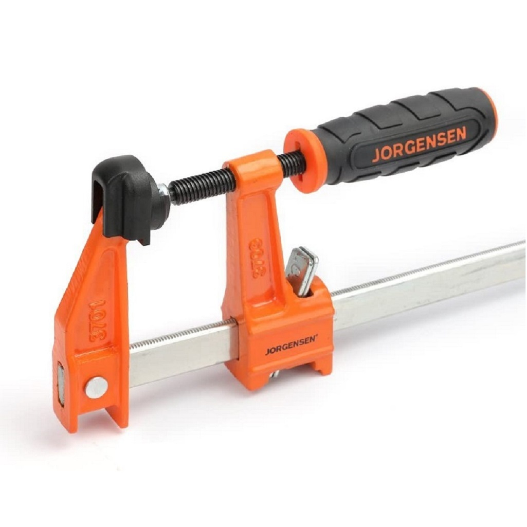 Струбцина F-образная Pony Jorgensen Medium-duty PJ3730, длина 762 мм предназначена для средних условий эксплуатации. Используется для плотного зажима деталей при склеивании или для фиксации их в процессе выполнения столярных, слесарных и прочих работ. Струбцина очень прочная. Чугунные стационарные и раздвижные головки с покрытием из оранжевого порошка соединены с высокоуглеродистой стальной направляющей, устойчивой к ржавчине. Направляющая обладает выдающейся прочностью на растяжение  - 6000 килограмм на квадратный сантиметр. Быстродействующая скользящая головка оснащена крестообразной резьбой для крепления винта из холоднотянутой стали. Рукоятка и поворотная опора обеспечивают удобство использования. Оригинальная многотарельчатая муфта надёжно фиксирует головку на любом участке направляющей.