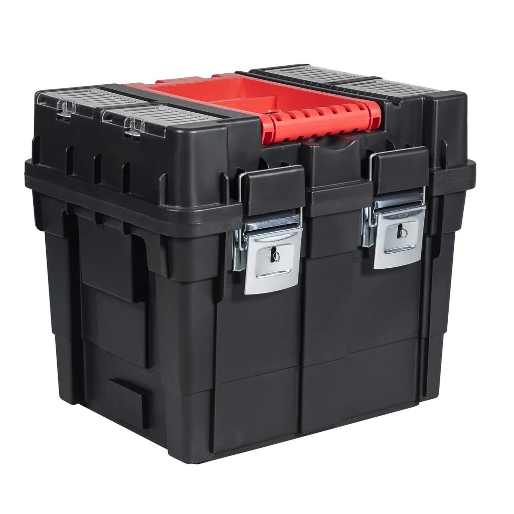 Размеры ящика составляют 450х395х350 мм, что делает его достаточно компактным для хранения, но при этом вместительным — объем главного отделения целых 62 литра. Вес с упаковкой всего 4.8 кг, что позволяет без труда переносить его с места на место. Внутри ящика предусмотрены два съемных отделения на двух ярусах, что облегчает организацию и доступ к инструментам.