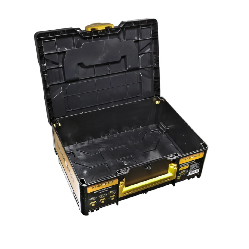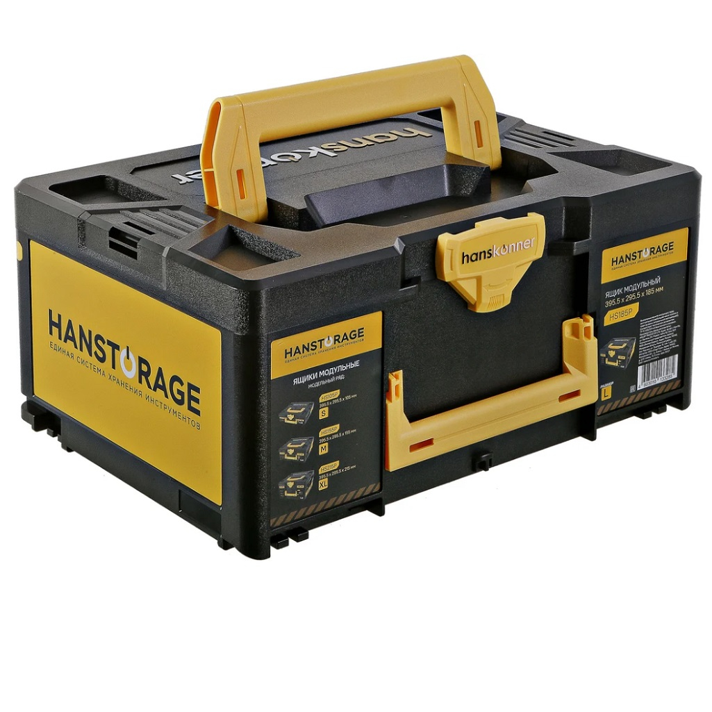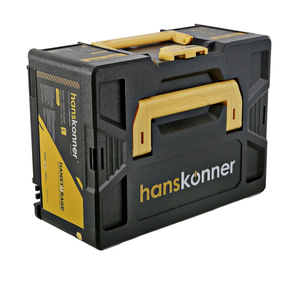 Ящик для инструмента Hanskonner HS185P модульный, размер L, единая система хранения - это универсальное решение для организации хранения и транспортировки инструментов и оборудования. Этот контейнер можно использовать как самостоятельно, так и в сочетании с другими контейнерами из серии HANSTORAGE (S, M, L, XL), создавая единый модуль. HansLock - это универсальный поворотный замок, который позволяет легко открывать и закрывать контейнер, а также соединять его с другими контейнерами. Ударопрочный пластик, из которого изготовлен контейнер, обеспечивает надёжную защиту содержимого. Допустимая нагрузка на крышку составляет 100 кг. 2 фиксируемые рукоятки служат для удобного перемещения и извлечения контейнера из стеллажа. Контейнер не имеет внутренних перегородок, что позволяет эффективно использовать всё внутреннее пространство. Ящик для инструмента Hanskonner HS215P модульный XL совместим с системами хранения FESTOOL SYS, TANOS, METABOX, MAKITA MAKPAC.