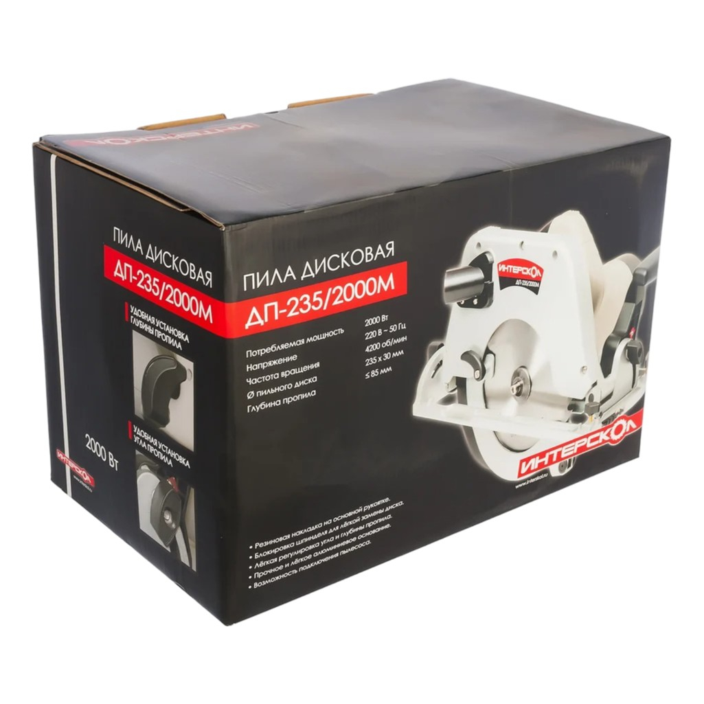 Пила дисковая Интерскол ДП-235/2000М, полупрофессиональная, 2 кВт предназначена для объемных и тяжелых работ с деревянным материалом, толщиной до 85 мм.