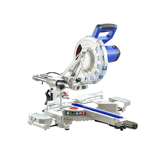 Поворотный рабочий стол выполнен из алюминиевого литья, что обеспечивает легкость и прочность конструкции. Пильный узел оснащен механизмом протяжки (горизонтальное перемещение), который обеспечивает продольный ход пильной части, увеличивая ширину пиления. Дополнительную точности реза обеспечивает лазерная направляющая. В комплект входит специальная струбцина для фиксации заготовки. Режущая головка оснащена автоматически закрывающимся защитным кожухом, гарантируя безопасность при работе. Патрубок для отвода отходов резания позволяет подключить вытяжное устройство.