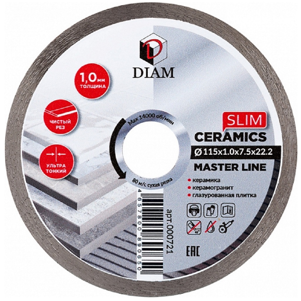 Описание диска DIAM Master Line CERAMICS SLIM керамика, керамогранит, глазурованная плитка 115х1.0х22.2 мм, 000721