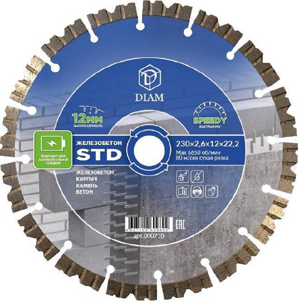 Описание диска DIAM STD железобетон, кирпич, камень, бетон 230х2.6х22.2 мм, 000710