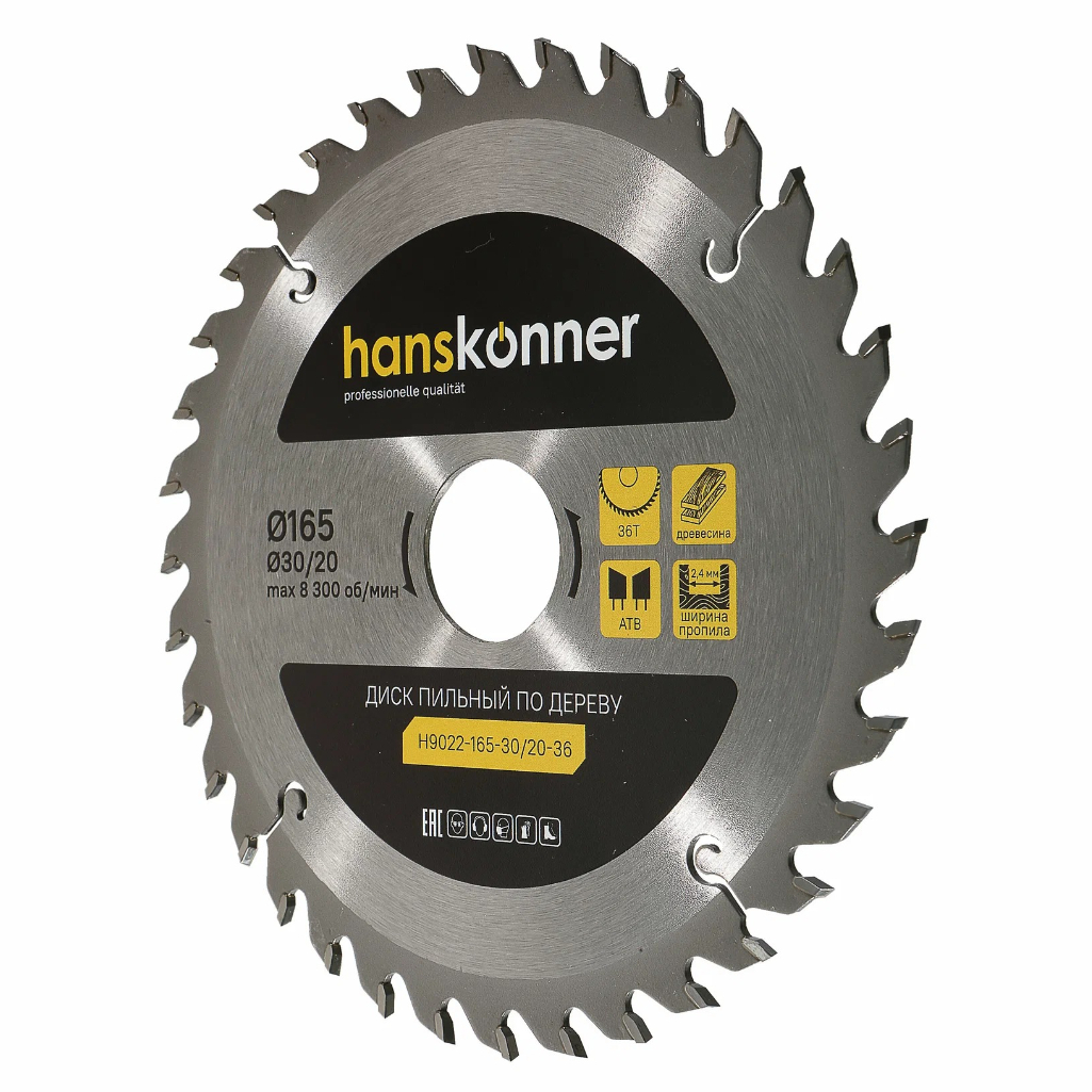 Диск пильный по дереву Hanskonner H9022-165-30/20-36T, 165х30/20 мм, 36 зубьев предназначен для поперечного пиления древесины различных типов, включая мягкие и твердые породы, ДСП, МДФ и фанеру. Благодаря твердосплавным напайкам из К10 и увеличению размера зуба в три раза, ресурс диска становится выше в три раза. Сварка с использованием серебра предотвращает выпадение зубьев при ударных нагрузках, что повышает надежность инструмента. Скорость работы увеличивается на 30%. Корпус диска изготовлен из стали марки 65Mn, что позволяет работать без перегрева в течение всего рабочего дня. Диск обеспечивает чистый рез. Диаметр 165 мм, толщина диска составляет 1.6 мм, ширина пропила - 2.4 мм, количество зубьев - 36 шт. Максимальная скорость вращения диска 8300 об/мин.
