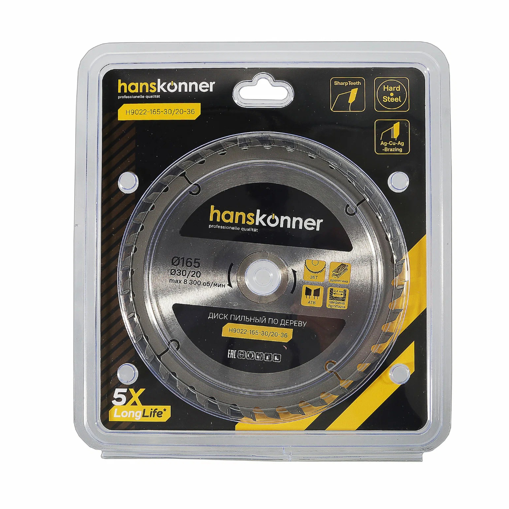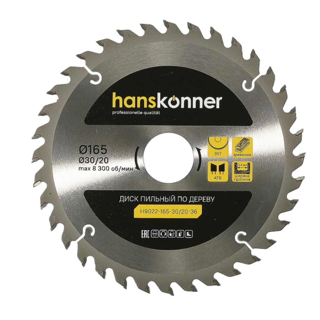 Описание диска по дереву Hanskonner H9022-165-30/20-36T, 165х30/20 мм, 36 зубьев