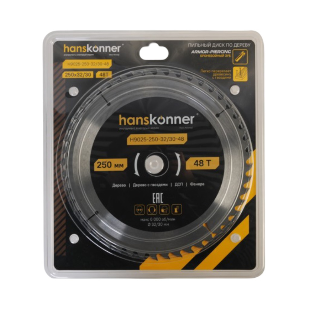 Диск пильный по дереву Hanskonner ArmorPiercing H9025-250-32/30-48T, 250x32/30мм, 48 зубьев