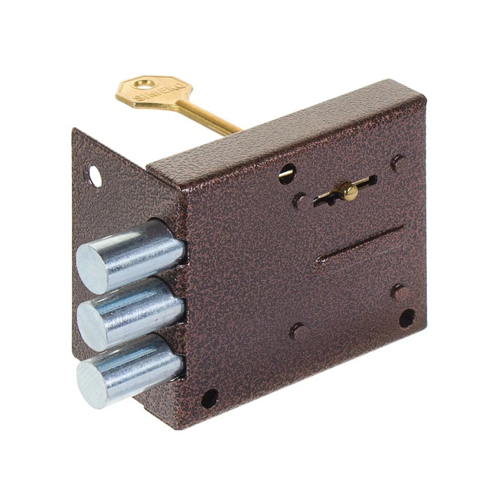 Накладной замок БИФ 0026 предназначен для установки на входных дверях в жилых, складских и коммерческих помещениях. Это простой механизм с автоматическим запиранием и средней взломостойкостью. Устройство легко устанавливается на деревянные и металлические дверные полотна любой толщины. Может использоваться как самостоятельно, так и в паре каким-нибудь другим замком. Дверь запирается на три металлических ригеля. С внутренней стороны положение засова регулируется при помощи классической поворотной ручки. Вес изделия составляет 680 г. В приобретаемый комплект входит набор из 3 ключей и ответная планка.