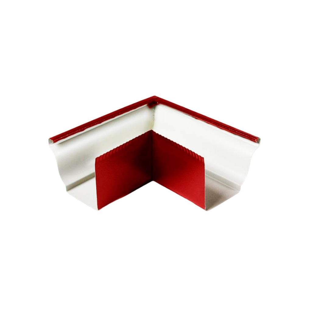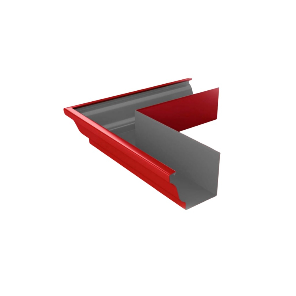 Угол желоба наружный, красный, 90 градусов, оцинкованная сталь - это элемент водосточной системы, устанавливаемый на внешние углы кровли и предназначенный для изменения направления движения воды.