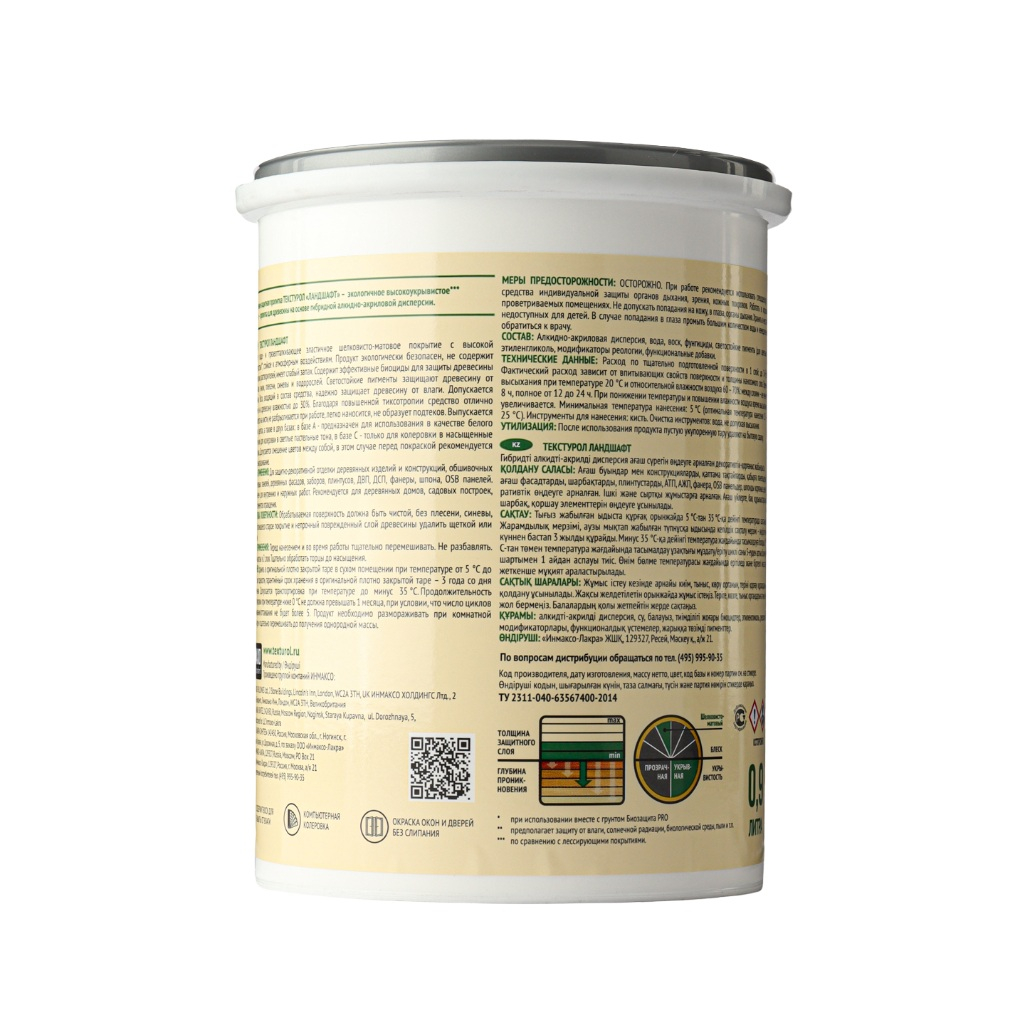 Пропитка Текстурол Ландшафт, защита и декор древесины, с воском, База А, белый, 0.9 л - это средство защиты, созданное на водной основе. Оно сочетает в себе декоративные и защитные свойства, обладает высокой укрывистостью и подходит как для внутренних, так и для наружных работ. Предназначено для отделки деревянных изделий и конструкций, включая обшивочные доски, стеновые панели, фасады, заборы, плинтусы, древесно-волокнистые и древесно-стружечные плиты, фанеру и шпон. Рекомендуется для использования в деревянных домах, садовых постройках и заборах. Создает шелковисто-матовое покрытие, которое подчеркивает текстуру древесины, при этом обладает высокой укрывистостью. Благодаря тиксотропности, состав легко и экономично наносится, без подтеков и разбрызгивания. Можно применять на древесине с влажностью до 30%.