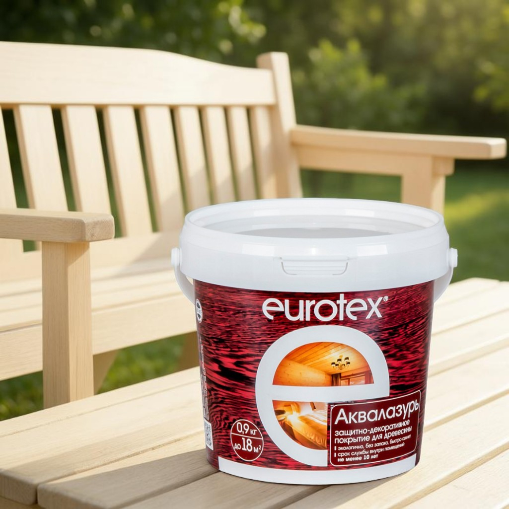 Защитно-декоративное покрытие для древесины Eurotex Аквалазурь, полуглянцевый блеск, Бесцветный, 0.9 кг предназначено для обработки как внутренних, так и наружных деревянных поверхностей. Оно идеально подходит для новых и старых (неокрашенных или очищенных от старого покрытия) деревянных материалов, таких как ДВП, ДСП, фанера, MDF, OSB и клееный брус. Продукт также может использоваться для минеральных поверхностей, включая кирпич, бетон и декоративную штукатурку.