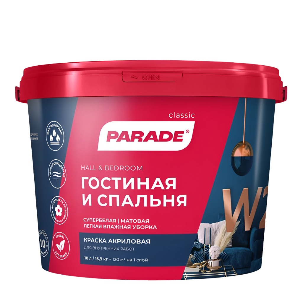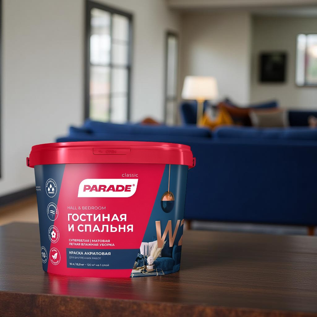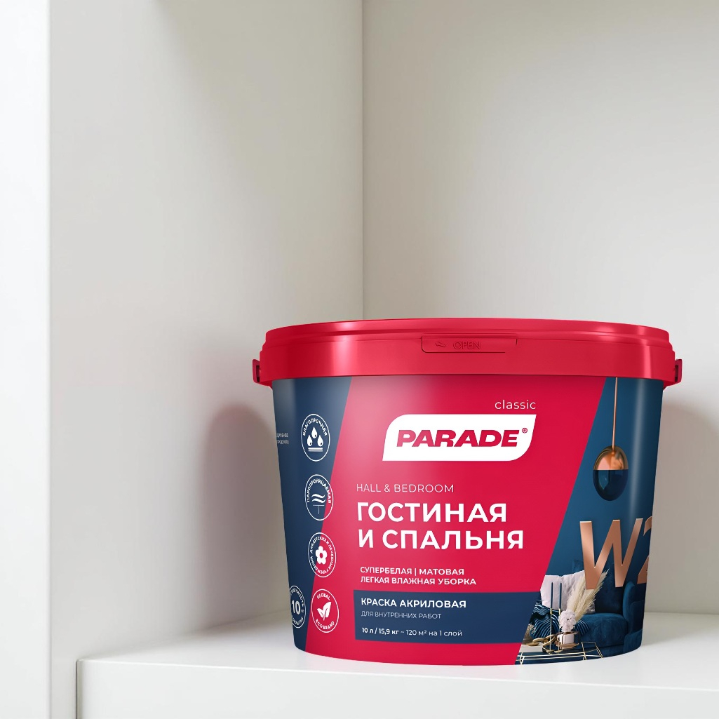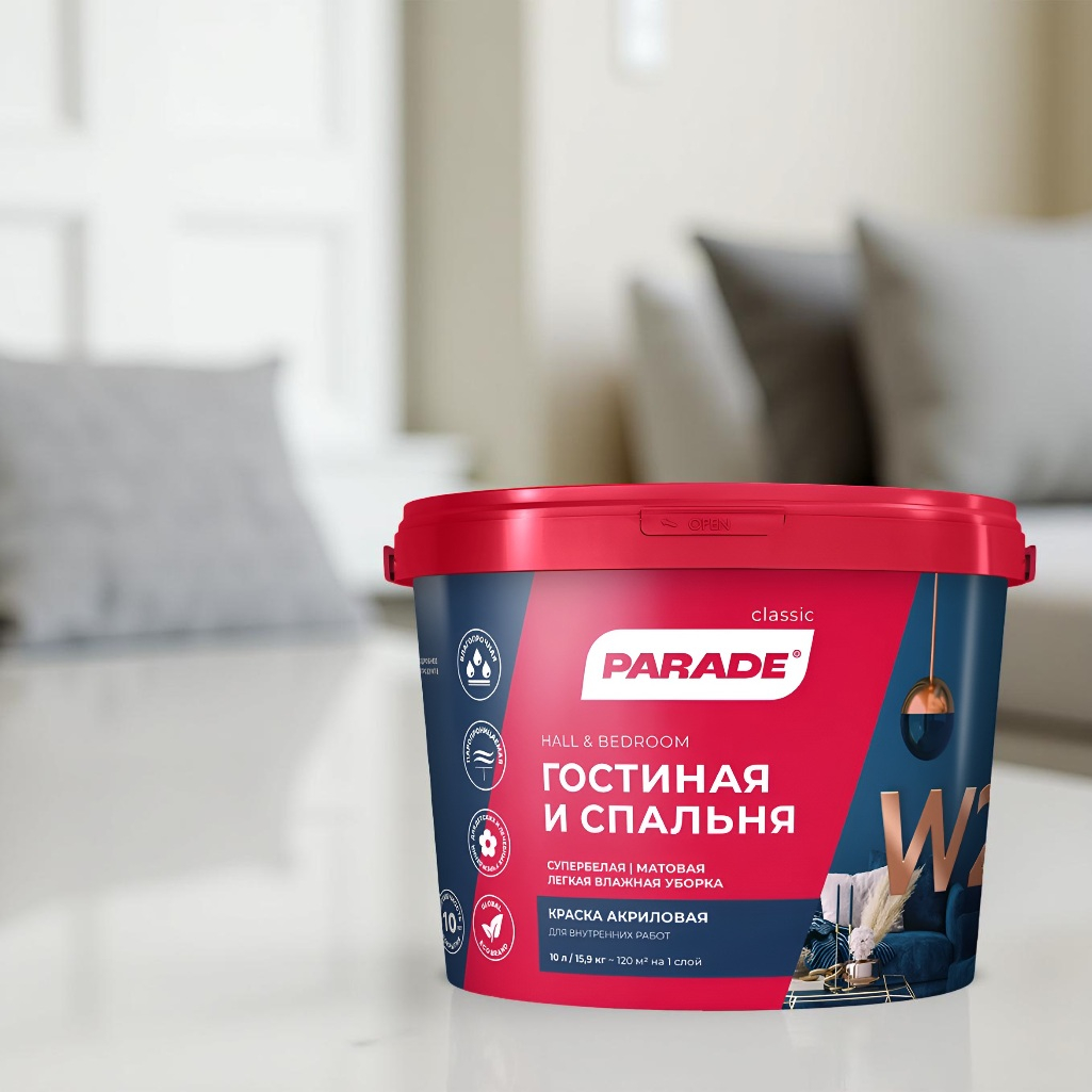 Описание краски PARADE classic Гостиная и спальня W2 супербелая матовая, 5 л