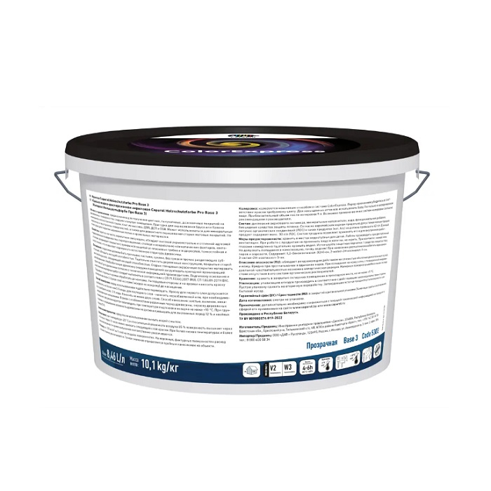Краска CAPAROL Holzschutzfarbe Pro эластичная трещиностойкая для дерева, База 3 бесцветная 8.46 л на основе акрилового связующего для защитно-декоративного покрытия деревянных поверхностей снаружи и внутри помещений, укрывистая, с очень высокой устойчивостью к выцветанию и пожелтению и превосходной сопротивляемостью механическим нагрузкам, обладает хорошим сцеплением с деревянными поверхностями. Колеруется по системе ColorExpress. Краска характеризуется прекрасной атмосферостойкостью и влагостойкостью, с высокой эластичностью - не трескается и не отслаивается при умеренных температурных и влажностных деформациях древесины. Формирует тонкое и дышащее покрытие, подчеркивая естественную фактуру древесины, обладает защитой от поражения поверхности плесневыми грибами и водорослями. Наносится краска кистью, валиком или распылителем. Перед покраской ее следует перемешать. Рекомендуется наносить при температуре от +10 °C. Более низкая температура нанесения способствует снижению качества формируемого покрытия несмотря на его способность к высыханию от + 1 °C.