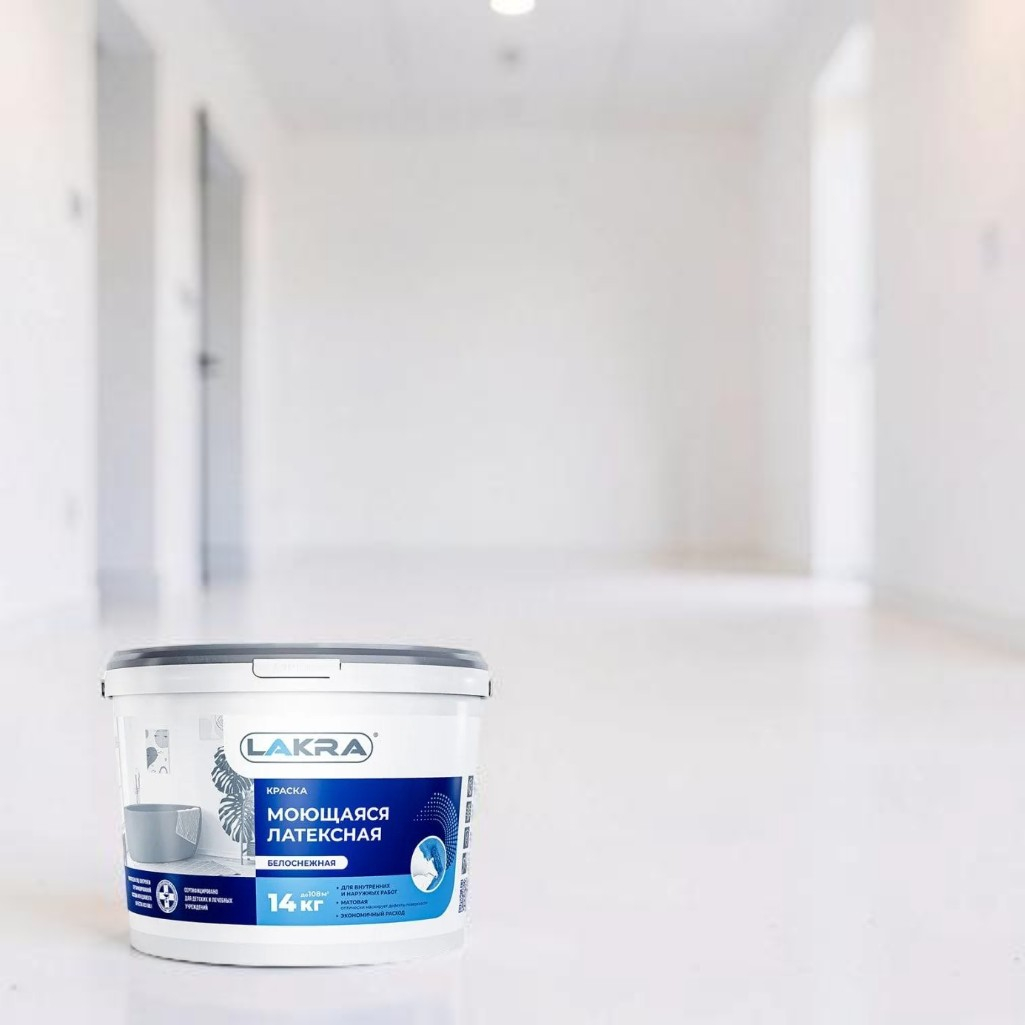 Описание краски Лакра 8306484 интерьерная, моющаяся, белоснежная, матовая, 14 кг