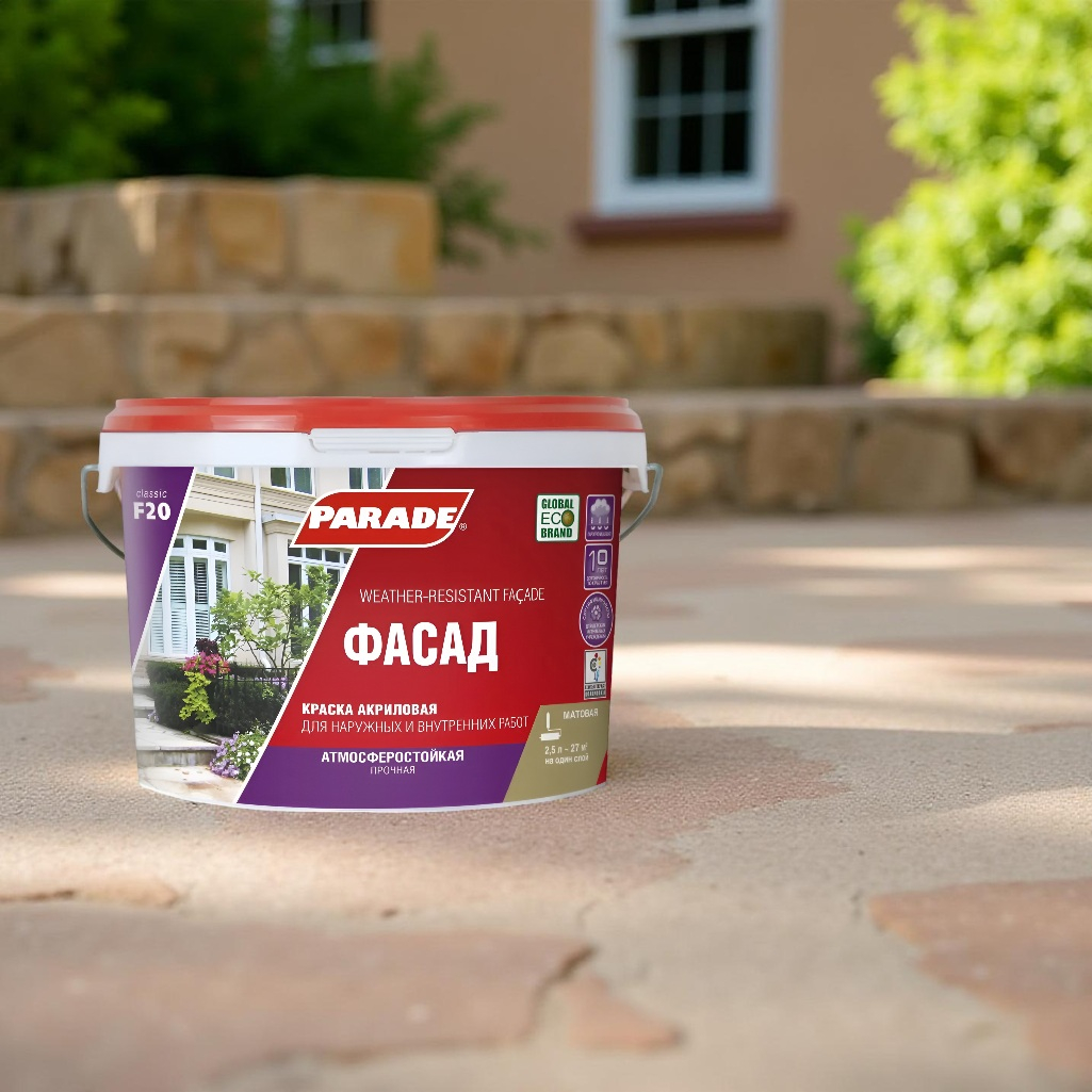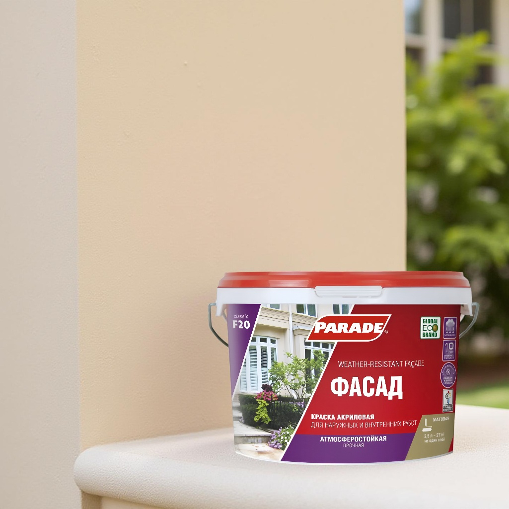 Краска акриловая PARADE classic Фасад F20 атмосферостойкая, База А, белая, 2.5 л применяется для наружных и внутренних работ. Образует паропроницаемое матовое покрытие, устойчивое к атмосферным воздействиям, УФ излучению, перепадам температур, влаге. Краска обладает высокими декоративными свойствами, отличной укрывистостью и прочным сцеплением с основанием. Покрытие выдерживает частую влажную уборку и сильные эксплуатационные нагрузки. Краска сертифицирована для применения в детских и лечебных учреждениях.