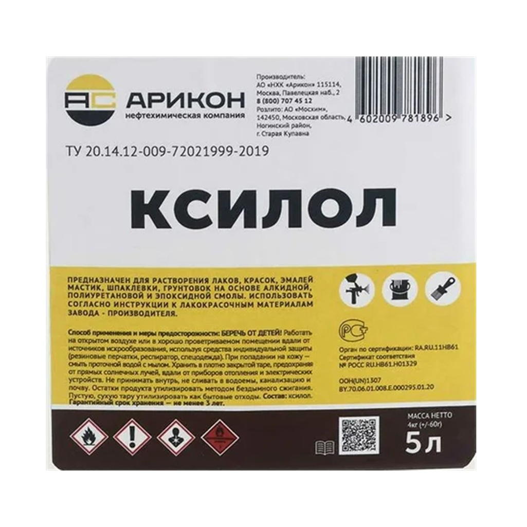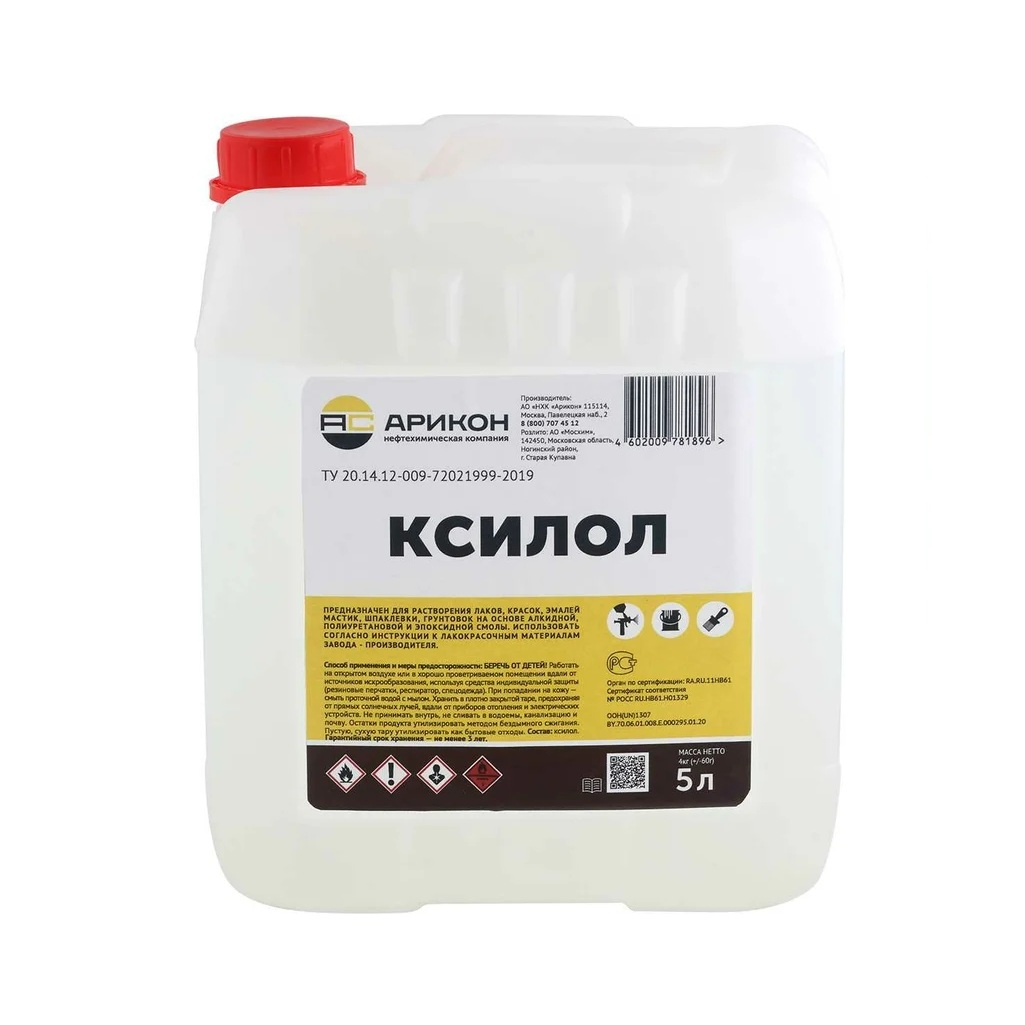 Технические характеристики ксилола Арикон для растворения лаков, красок, эмалей, мастик, 5 л