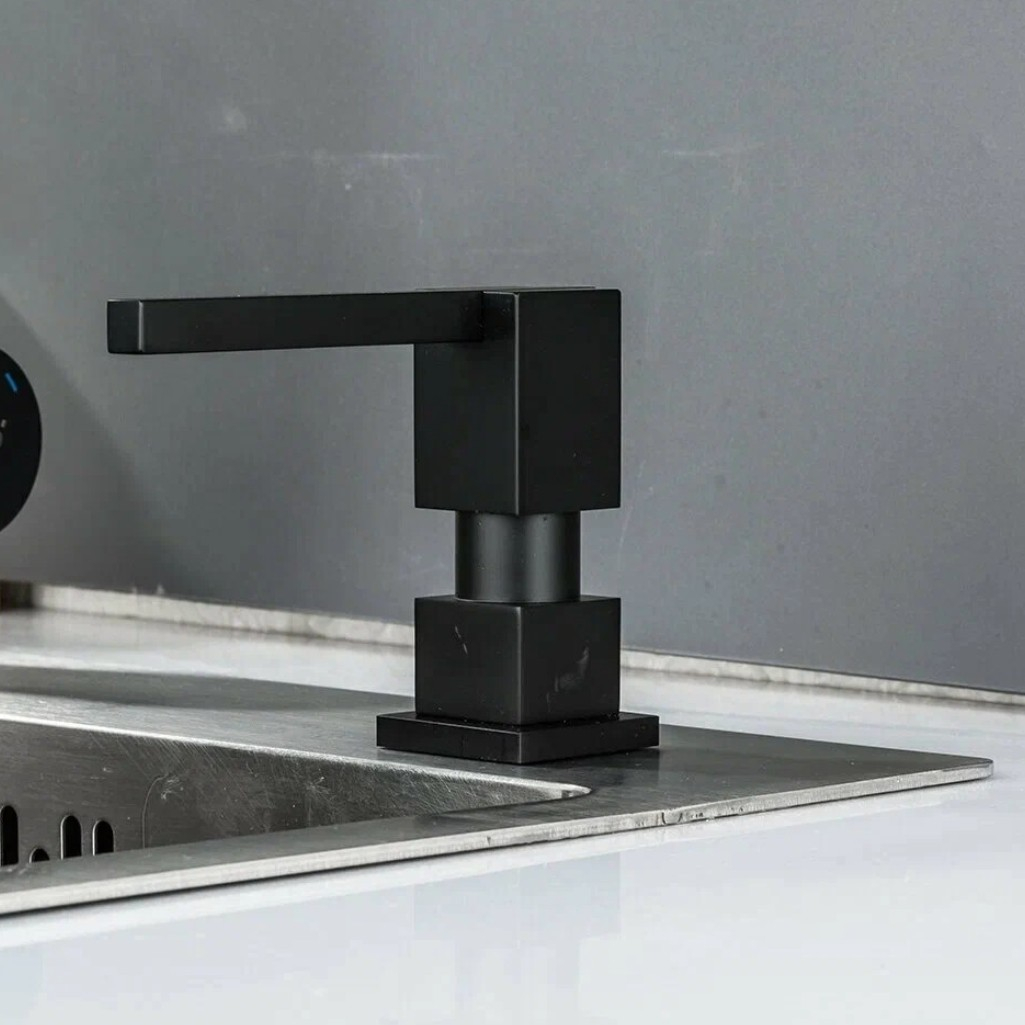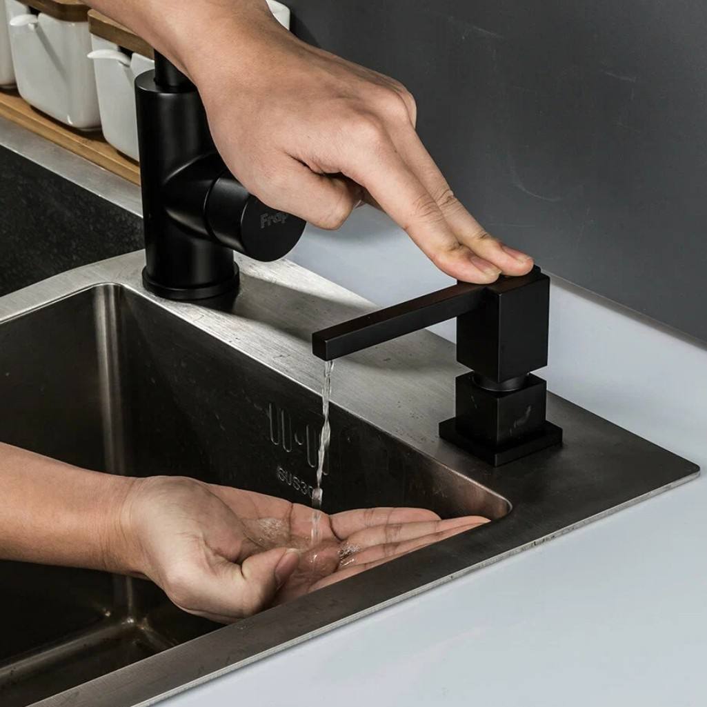 Дозатор жидкого мыла Gappo G404-1 встраиваемый, объем 300 мл, латунь, пластик, черный предназначен для использования на кухне или в ванной, чтобы для экономного расхода моющего средства. Оно устанавливается в раковину или рядом с ней на столешнице. Резервуар со средством находится под поверхностью, а сверху остается только носик, что исключает риск опрокидывания флакона во время использования. Этот аксессуар не только удобен, но и улучшает внешний вид вашей кухни. Дозатор можно заполнить не только мылом, но и гелем для мытья посуды. Корпус выполнен из латуни и пластика. Монтаж встраиваемый. Объем дозатора составляет 300 мл.