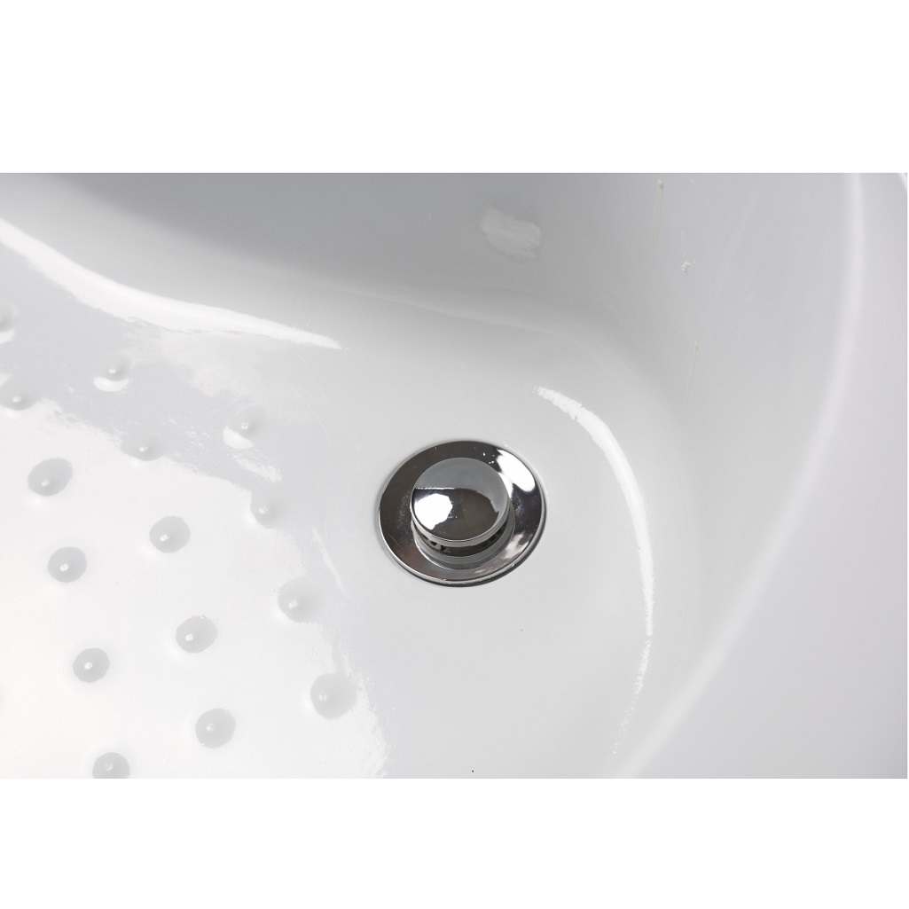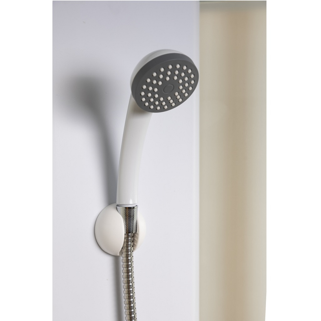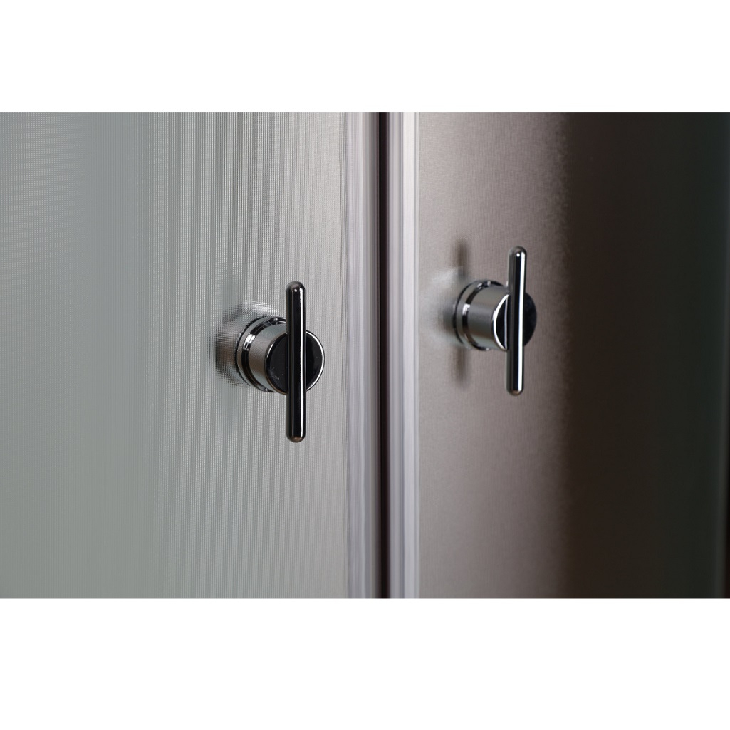 Стенки задние и передние, а также двери выполнены из каленого матового стекла белого цвета, толщина стекла 5 мм. Передние стенки неподвижные, двери - раздвижные. Материал смесителя - латунь, что обеспечивает длительный срок эксплуатации. Смеситель оснащен керамическим картриджем, имеет 2 положения, включает тропический душ и дополнительную душевую лейку.