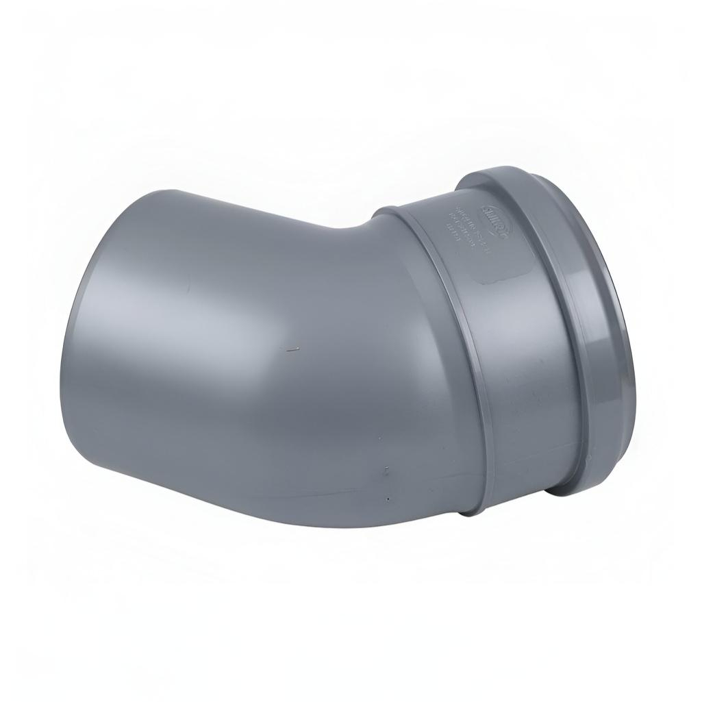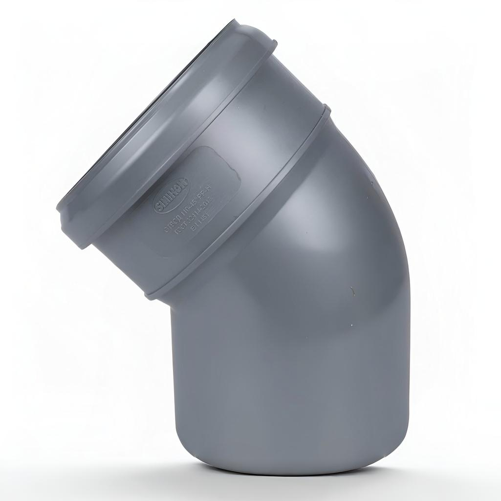 Отвод канализационный 45 гр. Sinikon 504053R диаметр 110 мм, серый — фасонная деталь для плавного изменения направления внутренней канализационной системы. Изготовлен из прочного полимера, устойчивого к агрессивным средам, перепадам температур и световому старению. Конструкция предотвращает образование засоров и обеспечивает долгий срок службы.
