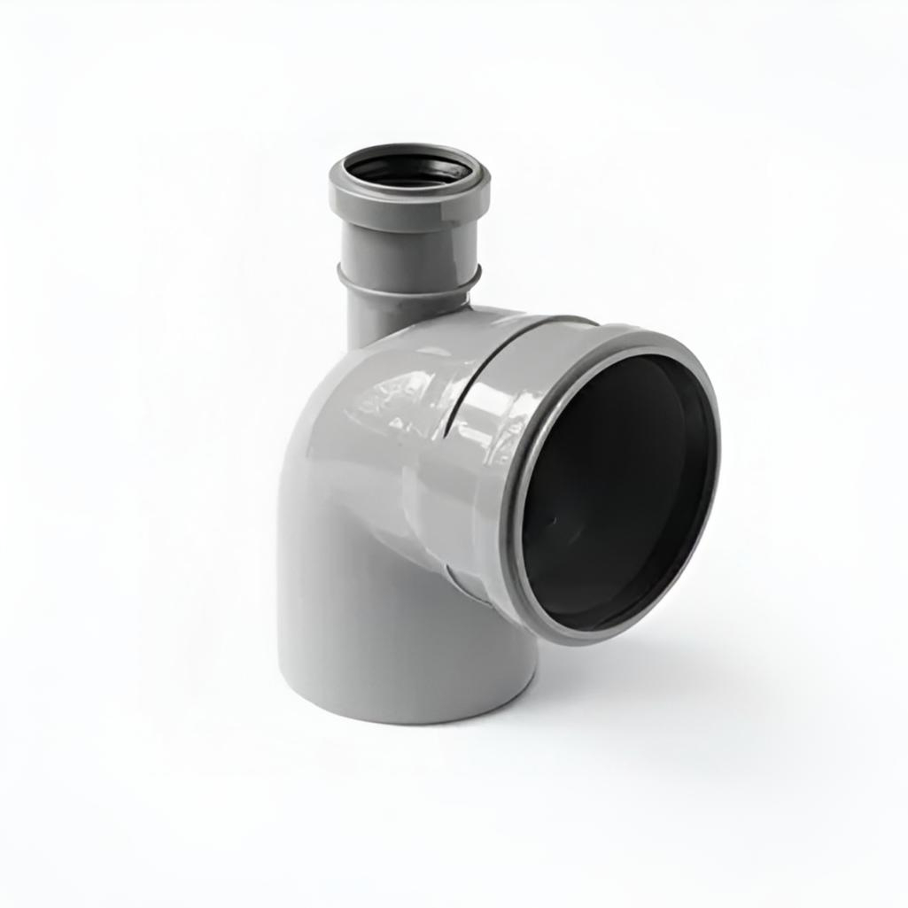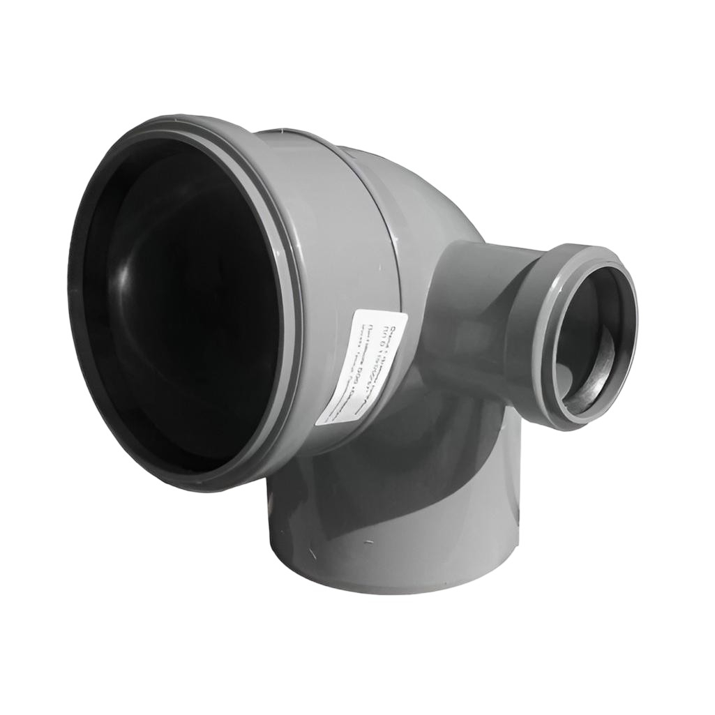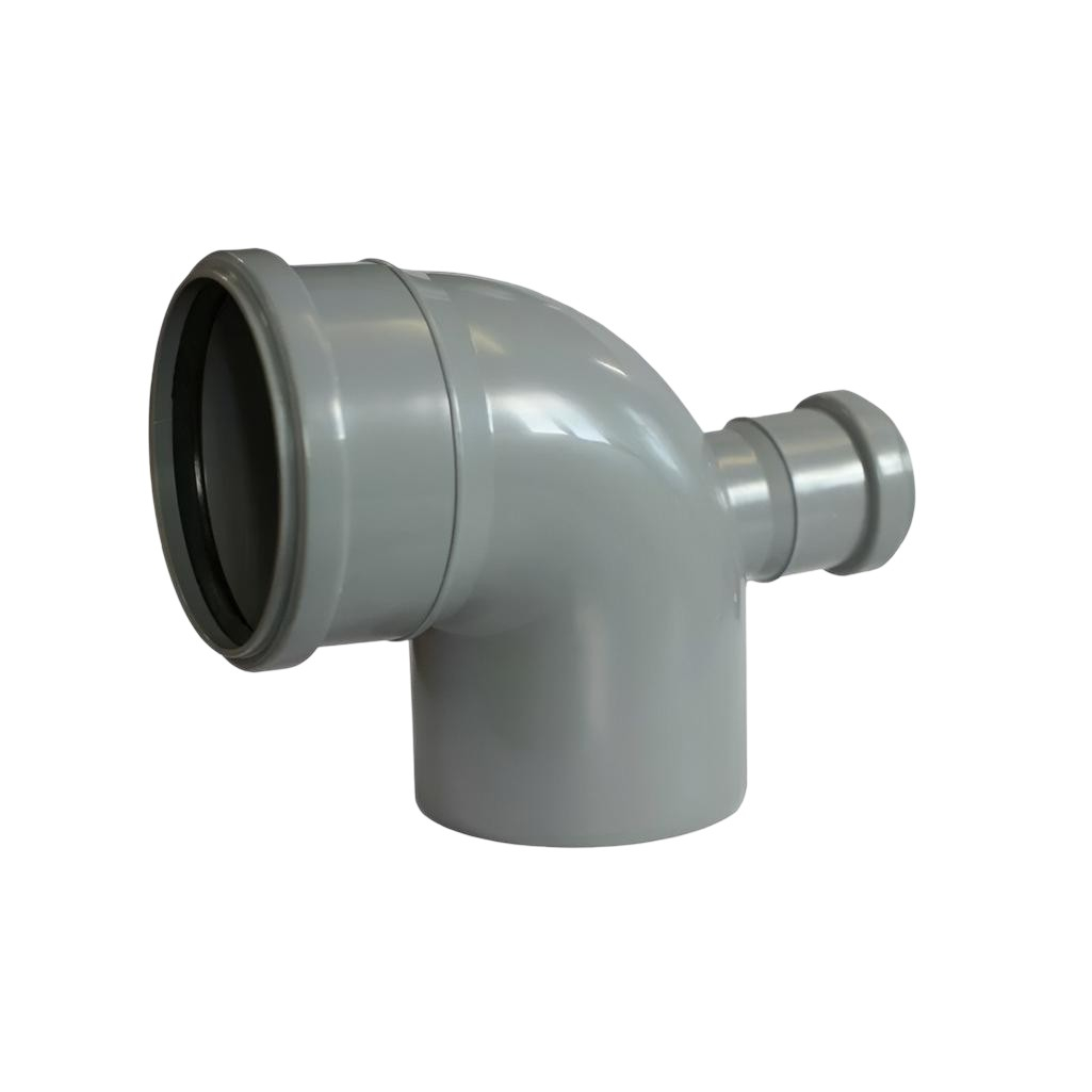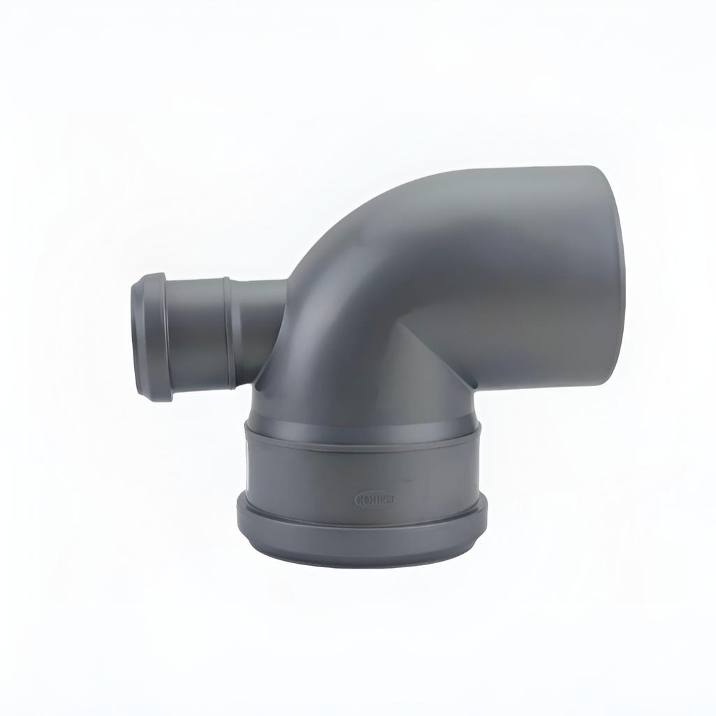 Отвод с фронтальным патрубком канализационный 90 гр. Sinikon 551001.R диаметр 50 мм, полипропилен, серый используется для создания отводов и изгибов, а также подключения дополнительных элементов и сантехнических устройств канализационных коммуникаций.