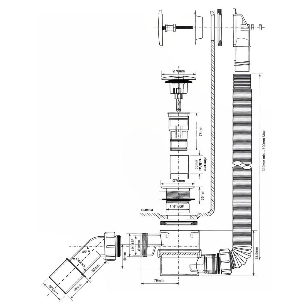 • Уникальная конструкция позволяет устранить засор через верхнюю ревизию, не разбирая сифон и не добираясь до труднодоступного пространства под ванной.