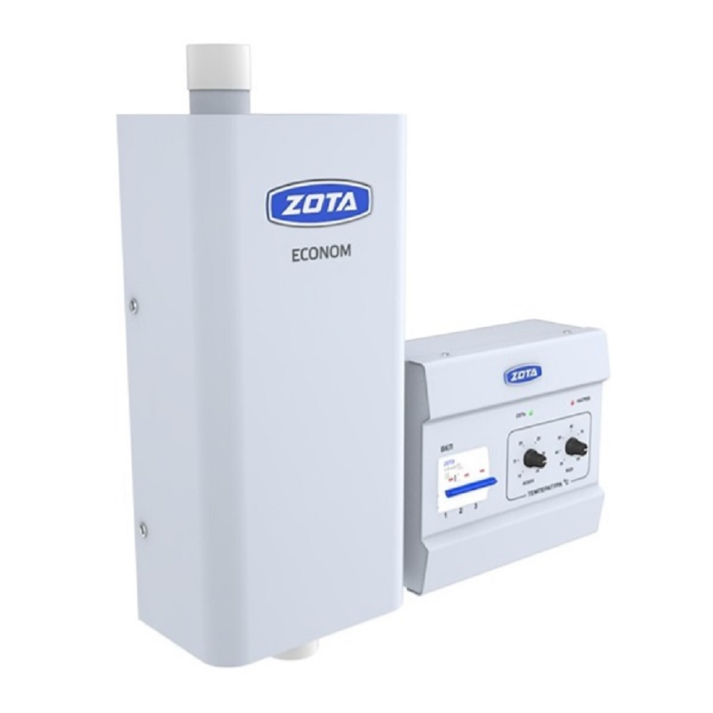 Настенный одноконтурный электрокотел ZOTA 7,5 Econom предназначен для автономного теплоснабжения помещений, может быть использован в системах с естественной циркуляцией теплоносителя. Особенностью изделия является разделение на котел и выносной пульт управления. Пульт управления может устанавливаться в любой части дома, работает по принципу силового реле или магнитного пускателя, является трехступенчатым, что позволяет эксплуатировать котел с ограничением мощности в ситуациях, когда это требуется.