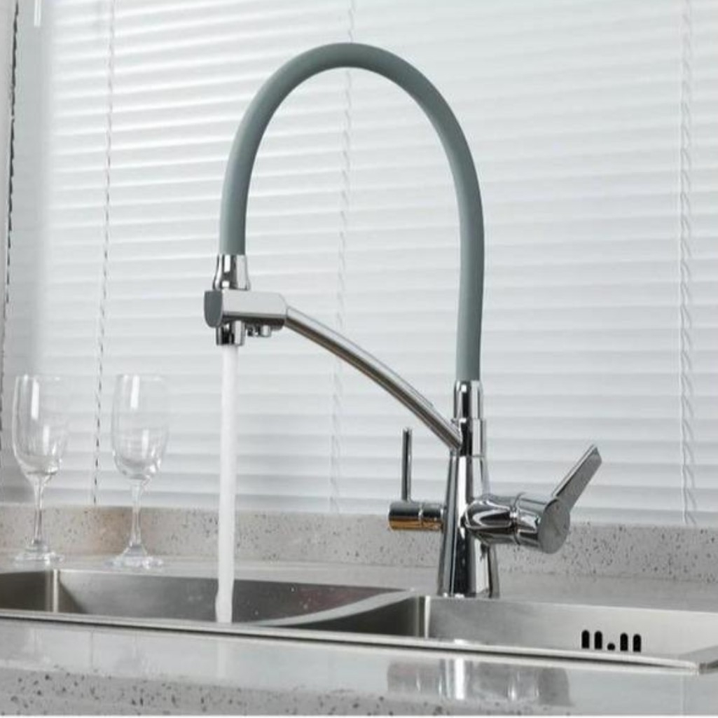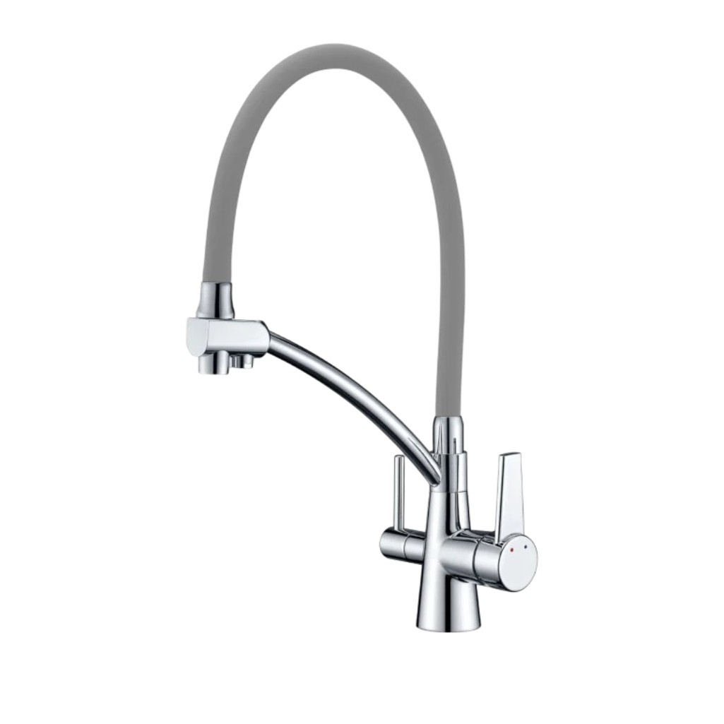 Смеситель для кухни Gappo G4398-17, серый/хром — это однорычажный смеситель с гибким изливом и функцией подключения фильтра питьевой воды. Модель объединяет два крана в одном корпусе и отличается эргономичным современным дизайном.