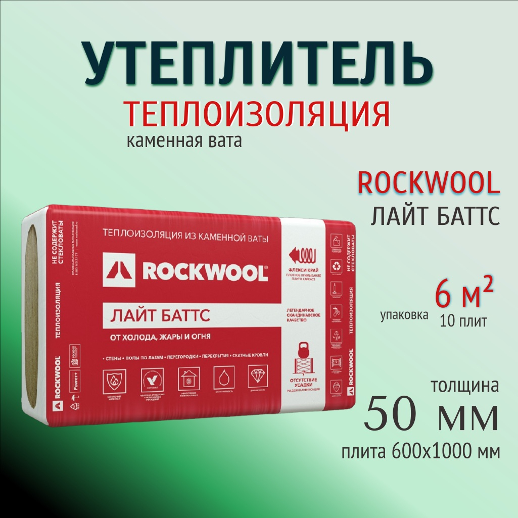 Утеплитель Rockwool Лайт Баттс для перекрытий, стен 50х600х1000 мм, 6 кв.м, 10 плит
