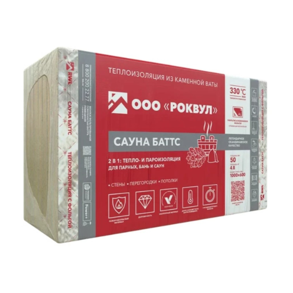 Утеплитель Rockwool Сауна Баттс фольга, для стен, 50х600х1000 мм, 4.8 кв.м, 8 плит - это легкие теплоизоляционные плиты, из минеральной ваты на основе базальтовых пород с дополнительным односторонним покрытием из алюминиевой фольги. Предназначены для использования в качестве тепло- и пароизоляционного слоя в саунах, банях и помещениях с повышенной влажностью. Применение фольгированной ваты за счет отражающей способности фольги позволяет уменьшать теплопотери через стены и кровлю, удерживать пар в парильном помещении, а также предотвратить проникновение сырости внутрь конструкции здания, возникающую при периодическом изменении температуры и влажности внутри помещения. При монтаже не требуют устройства дополнительного слоя пароизоляции за счёт покрытия алюминиевой фольгой, которая так же обладает теплоотражающими свойствами.