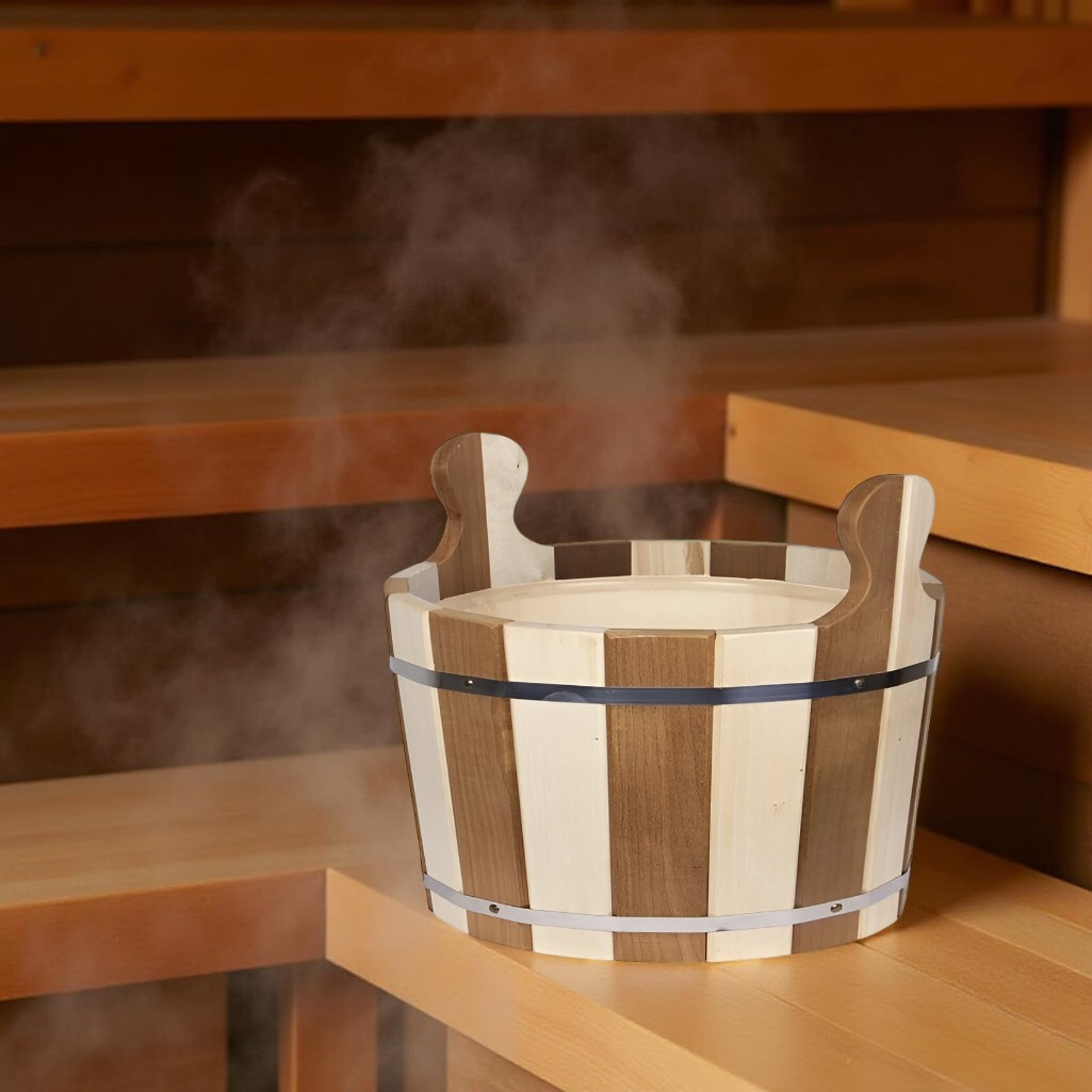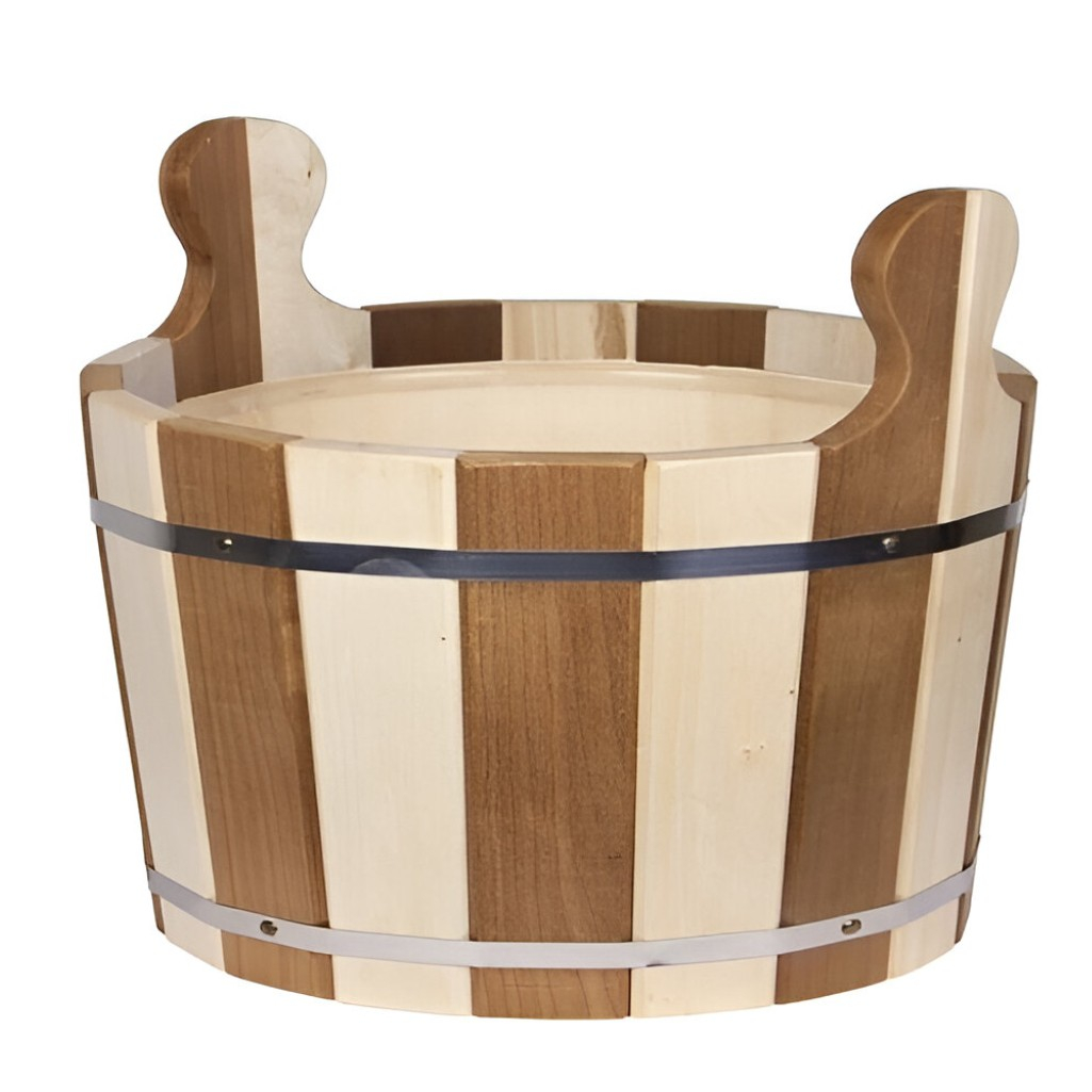 Описание ушата для бани и сауны, Банная линия Капучино 12-399, объем 10 л, Липа, вставка из пластика, дерево