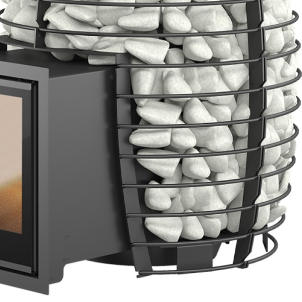 Печь для бани Everest Steam Heat 24, дверца со стеклом, 24 кВт, d115 мм, до 24 куб.м предназначена для нагрева парной объемом от 12 до 24 куб. метров. Усиленная кольцевая сетка, интегрированная в конструкцию конвектора, придает печи стильный и современный вид. В неё можно загрузить от 140 до 200 кг камней, в зависимости от их типа, плотности укладки и размера фракции. Крышка печи легко снимается, что позволяет быстро и удобно обслуживать каменку. Рядом с ней расположены две воронки для подачи воды на разные уровни закладки камней. Стартовый участок дымоотводящей трубы с толщиной стенки 10 мм и диаметром 115 мм обеспечивает максимальный теплосъем. Это увеличивает площадь нагрева закладки внутри каменки и ускоряет выход печи на рабочий режим. Дно закрытой каменки толщиной 24 мм не только отделяет топочную камеру от каменки, но и служит мощным теплоаккумулятором, накапливая и отдавая энергию в закладку. На пламегасителе предусмотрено кольцо, которое способствует более сложному отводу дымовых газов и повышает КПД печи. Новая интегрированная каминная дверка не только сохраняет все функции банной печи, но и придает ей стильный вид, делая управление более удобным. Сверху дверки расположена регулировка системы "чистое стекло", а снизу - управление подачей воздуха в колосниковую зону и зону вторичного дожига. Особого внимания заслуживает система выхода пара. Печь не только генерирует мягкий, приятный и мелкодисперсный пар, но и сопровождается эффектным звуком вьюги.
