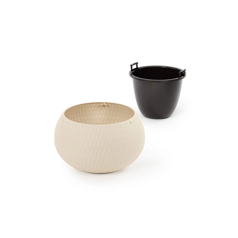 Кашпо Жемчужина подвесное, бежевый 7л предназначено для выращивания комнатных и уличных растений. Оно имеет два варианта использования: стоя на полу или подоконнике и в комплектации с подвесным металлическим механизмом, что позволит подвешивать кашпо как дома, так и на садовых участках, расширяя варианты выбора растений от прямых до вьющихся. Кашпо состоит из двух частей. Внутренняя вставка имеет отверстия и предотвращает перелив растений и загнивание корней. Внешняя часть защищает кашпо от протекания, а многогранная поверхность придает визуальную легкость и особенную эстетику изделию. Благодаря необычной сферической форме оно станет украшением любого интерьера.