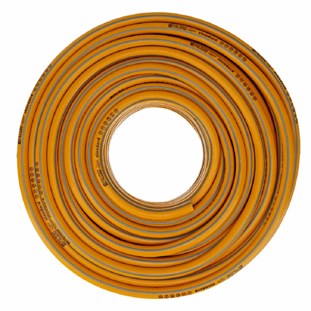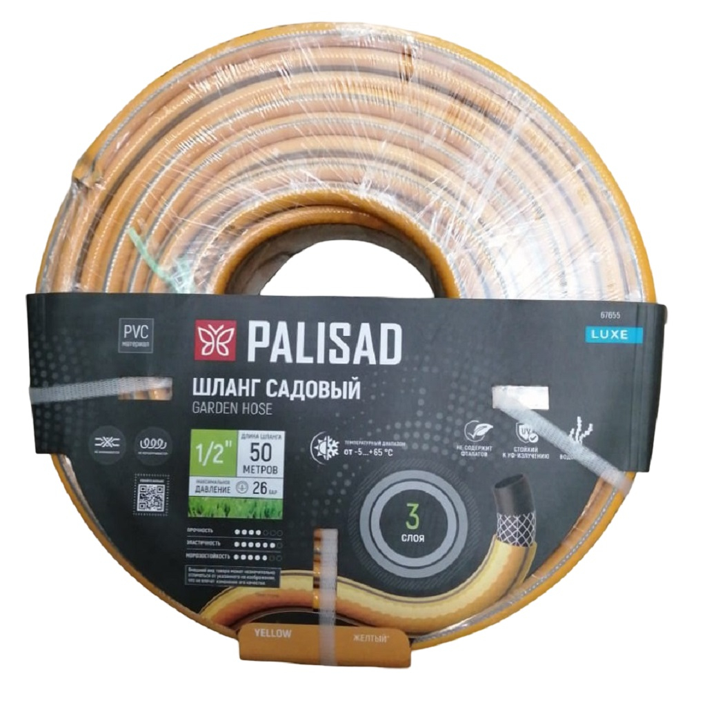 Шланг поливочный Palisad Luxe Standart 1/2" 67655, армированный, бухта 50 м предназначен для полива и орошения садового участка, газона, различных зеленых насаждений. Шланг состоит из 3-х слоев: первые два из ПВХ придают ему гибкость, а третий - из многонитиевого полиэстра - упрочняет конструкцию. Такое строение увеличивает срок службы шланга. Он выдерживает интенсивные нагрузки и не перекручивается благодаря высококачественному, прочному полимерному покрытию. Гладкая поверхность шланга предотвращает его от повреждений и порезов, а также обеспечивает его легкое перемещение на различных неровностях.