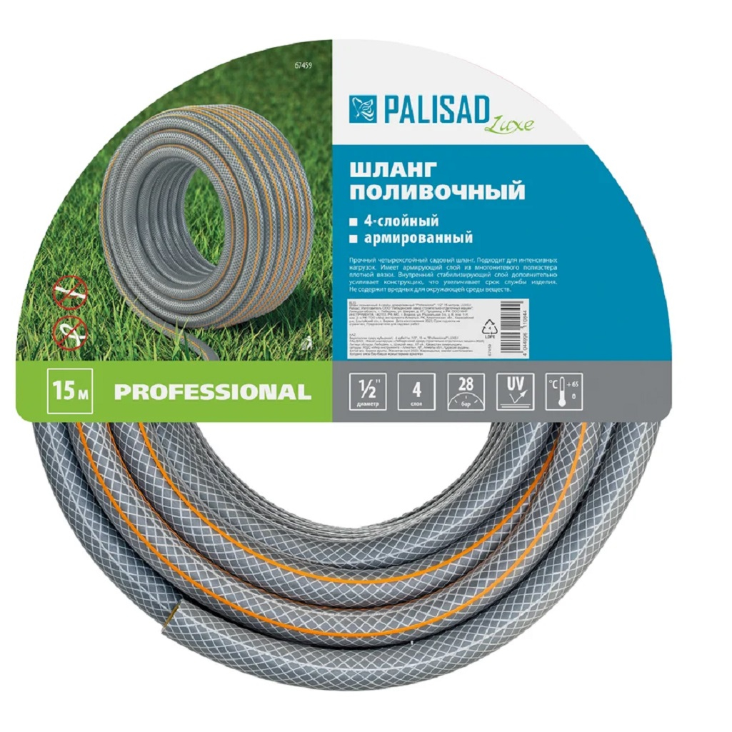 Шланг поливочный Palisad Luxe Professional 1/2" 67459, для интенсивных нагрузок, армированный, бухта 15 м предназначен для полива садовых и парковых участков. Шланг имеет 4 слоя, рассчитан на интенсивные нагрузки. Армирующий слой изготовлен из многонитиевого полиэстера плотной вязки. Внутренний стабилизирующий слой дополнительно усиливает конструкцию, увеличивая срок службы шланга. Изделие не содержит вредных для окружающей среды веществ.