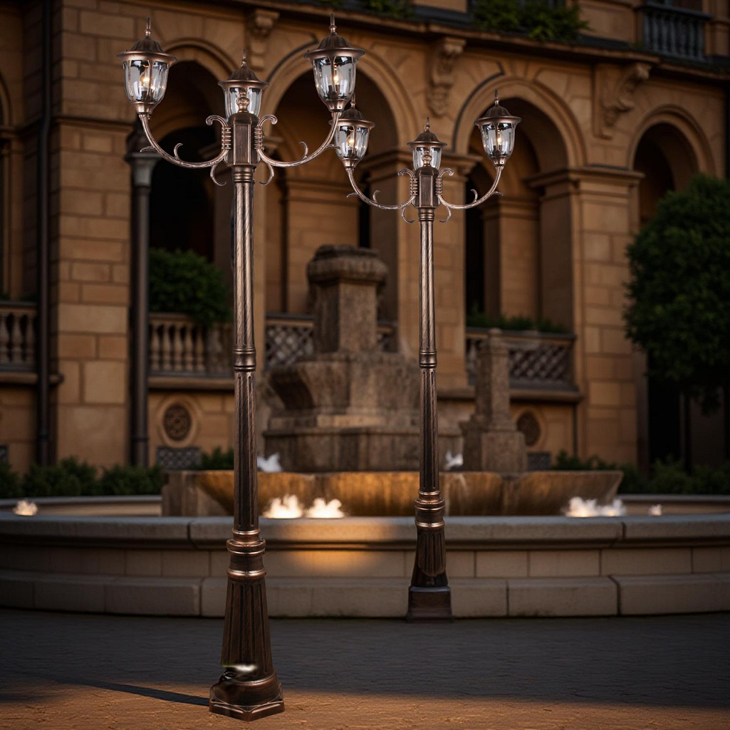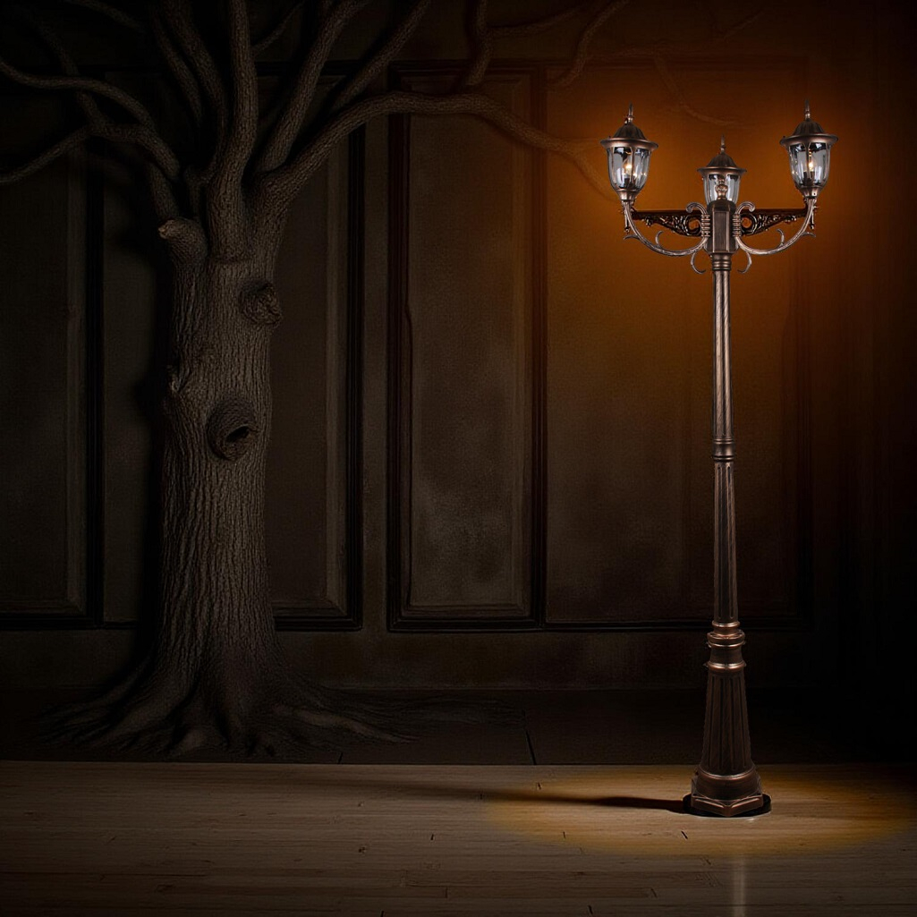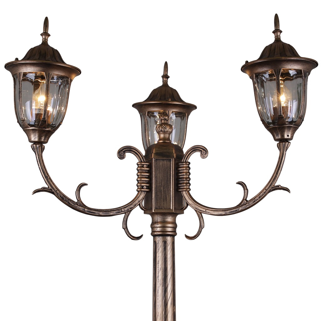 Светильник уличный Reluce 00867-0.7-003SL 2.0M BKG ландшафтный, 60 Вт, Е27, IP44, бронза  предназначен для оформления садов и парков, украшения уличных композиций, декорирования придомовых территорий. Площадь освещения составляет примерно 9 кв.м. Светильник крепится на грунт, светильник имеет высоту 200 см. Конструкция плафонов, которые выполнены в старинном стиле, защищает стеклянную часть от осадков.  Плафоны и основание светильника изготовлены из металла. Светильник оснащен 3-мя плафонами. Лампа накаливания мощностью 60 Вт обеспечит яркий свет на территории.   Маркировка IP44 означает защиту устройства от проникновения пыли, однако, светильник не защищен от сильного дождя или полного погружения в воду.